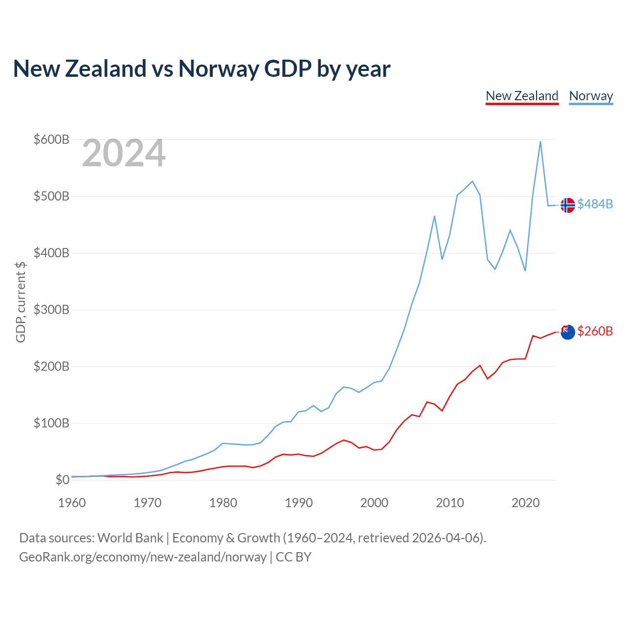 New Zealand has a GDP of $260B compared to $484B for Norway, ranking 52/197 and 32/197 by economy size, respectively.