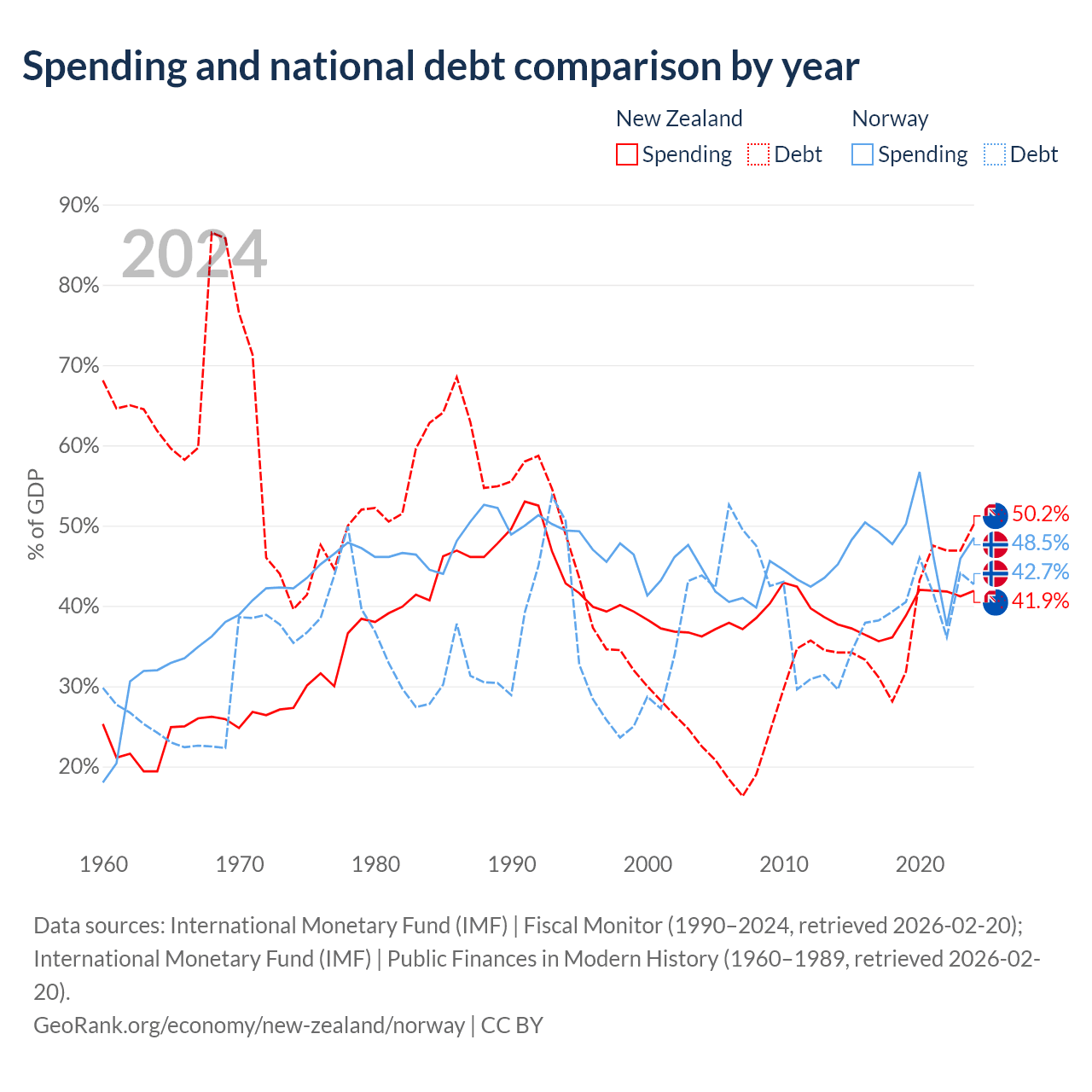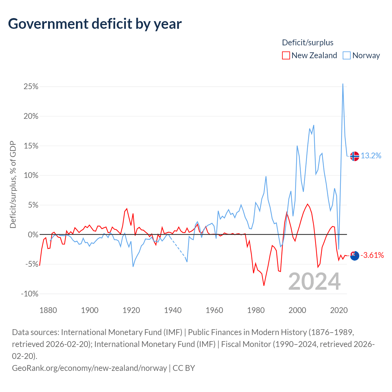 New Zealand has $131B in government debt (50.2% of GDP), compared to $207B (42.7% of GDP) in Norway.