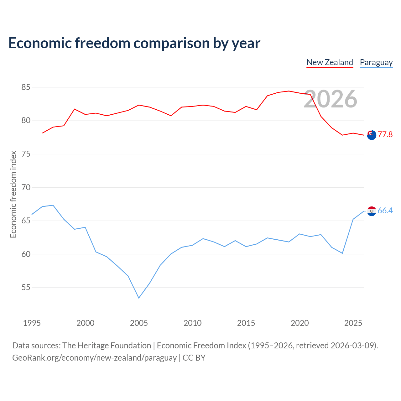 The Economic Freedom Index for New Zealand is 77.8, ranking 13/197, compared to 66.4 for Paraguay, ranking 61/197. The chart above displays a comparison of annual changes in economic freedom indexes.