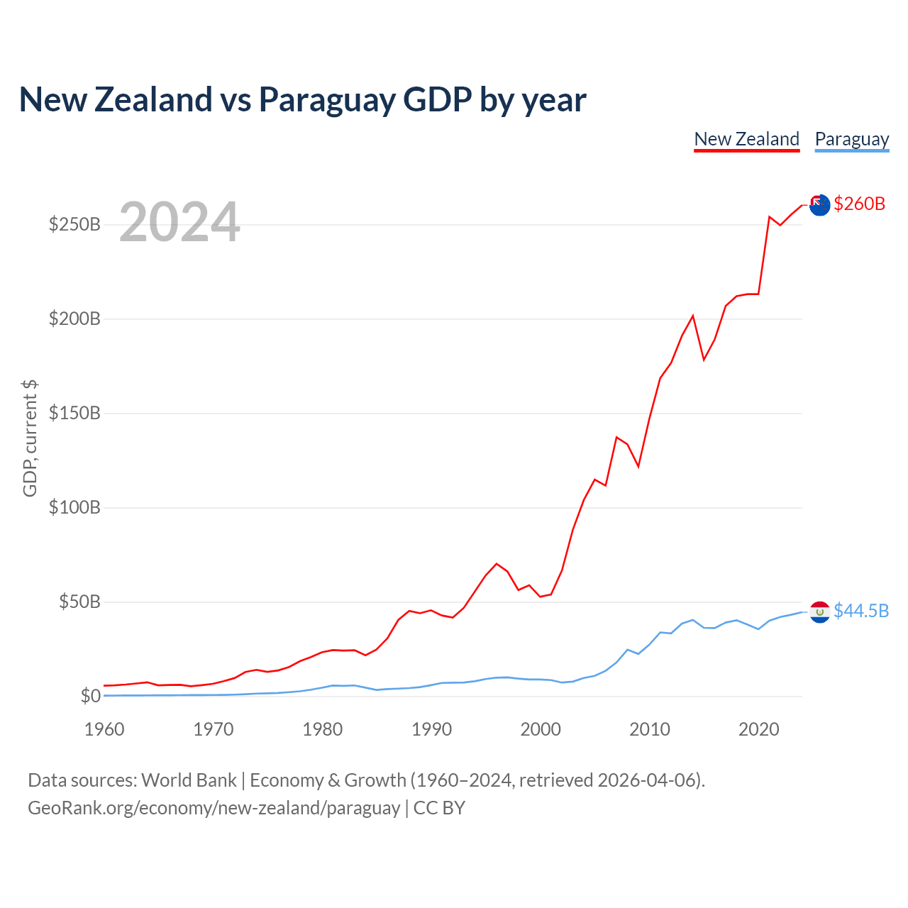 New Zealand has a GDP of $260B compared to $44.5B for Paraguay, ranking 52/197 and 98/197 by economy size, respectively.