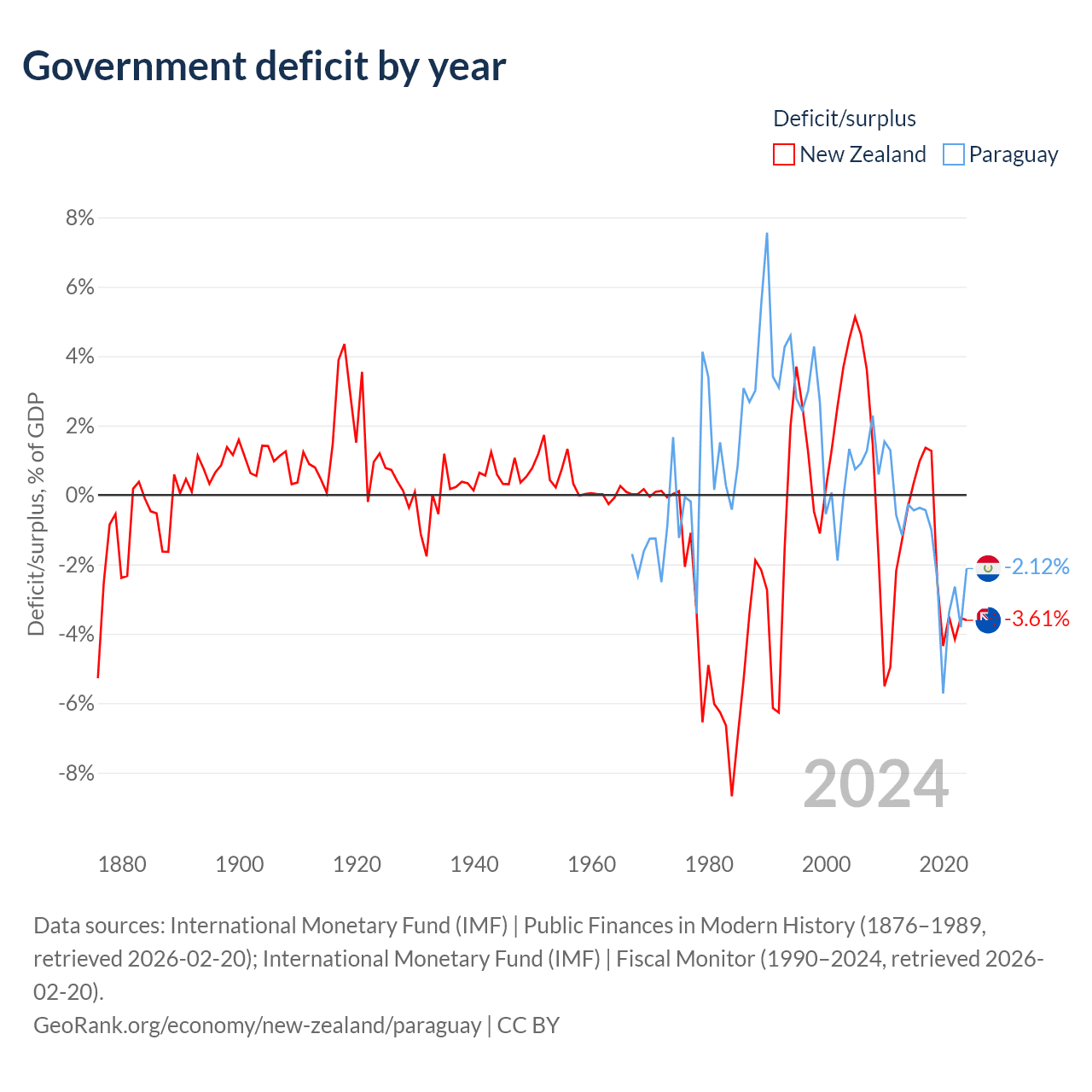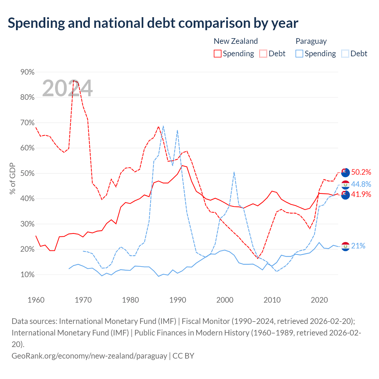 New Zealand has $131B in government debt (50.2% of GDP), compared to $19.9B (44.8% of GDP) in Paraguay.