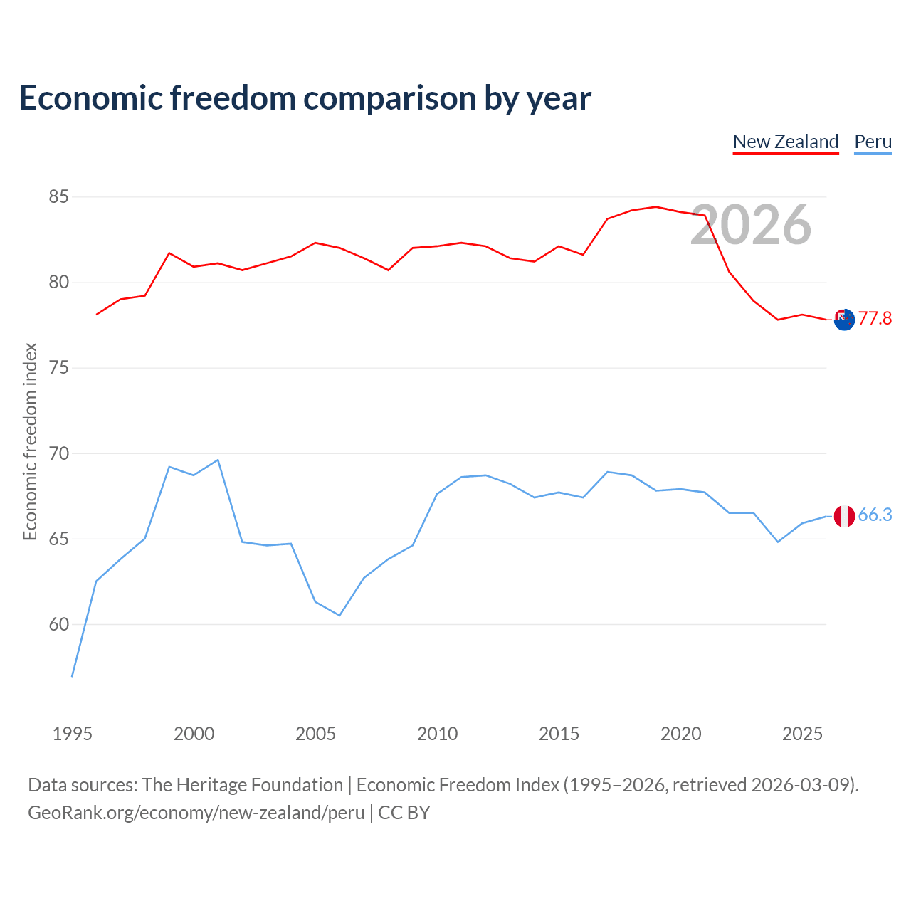 The Economic Freedom Index for New Zealand is 77.8, ranking 13/197, compared to 66.3 for Peru, ranking 62/197. The chart above displays a comparison of annual changes in economic freedom indexes.