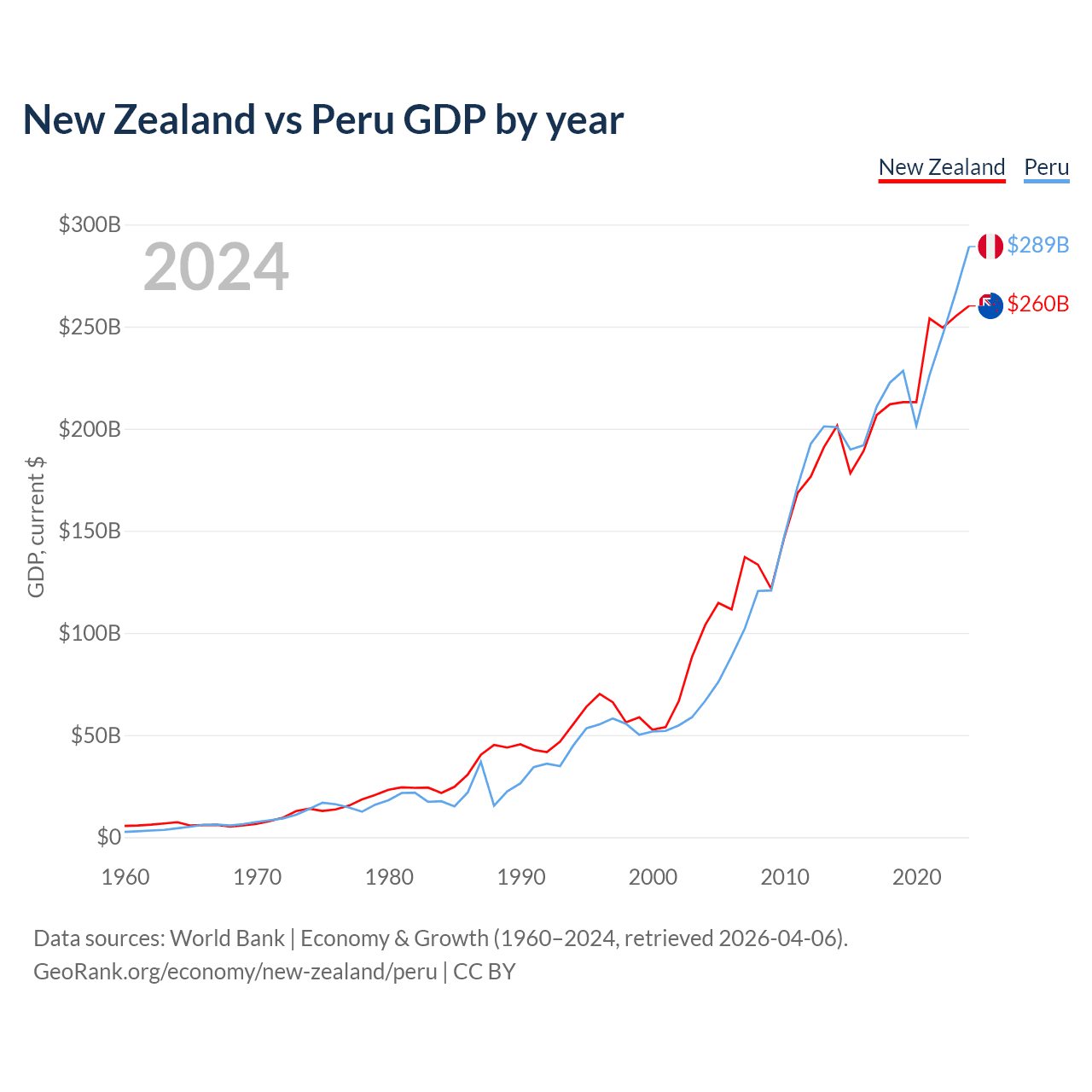 New Zealand vs Peru GDP by year