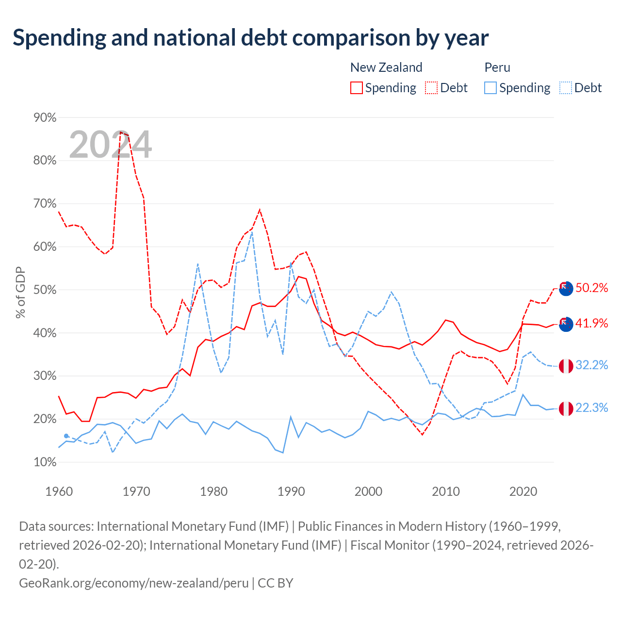 New Zealand has $131B in government debt (50.2% of GDP), compared to $93B (32.2% of GDP) in Peru.