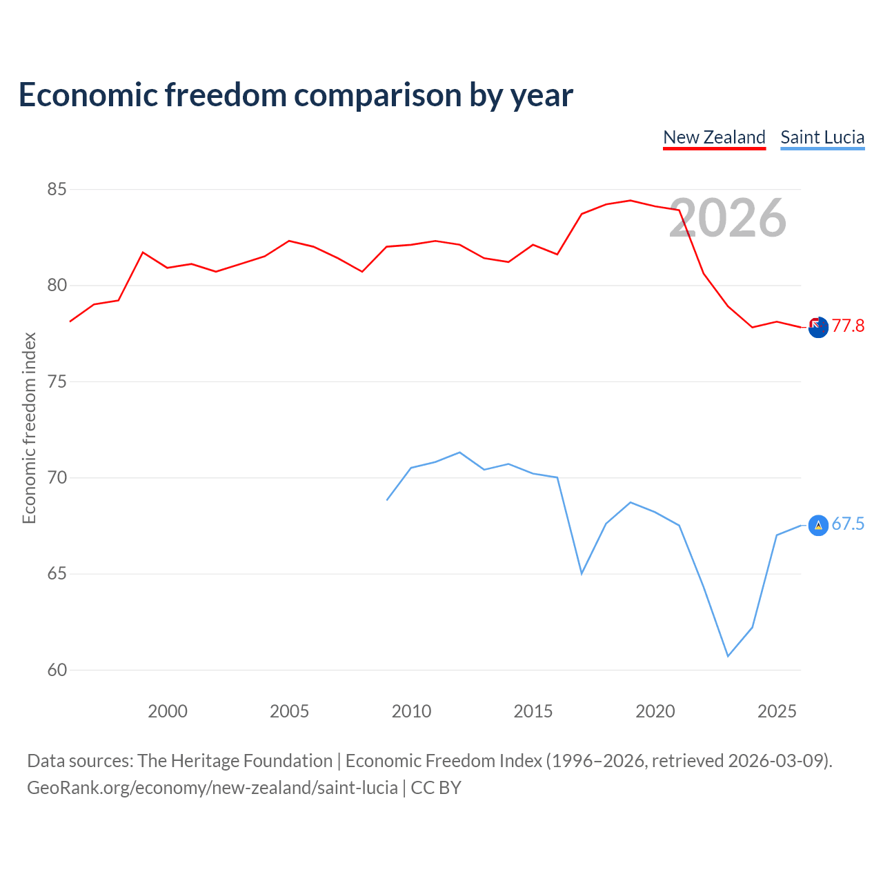 The Economic Freedom Index for New Zealand is 77.8, ranking 13/197, compared to 67.5 for Saint Lucia, ranking 57/197. The chart above displays a comparison of annual changes in economic freedom indexes.