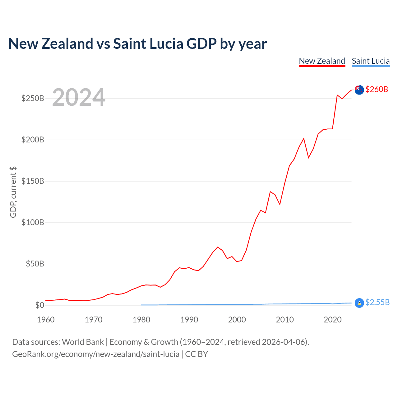 New Zealand has a GDP of $260B compared to $2.55B for Saint Lucia, ranking 52/197 and 173/197 by economy size, respectively.