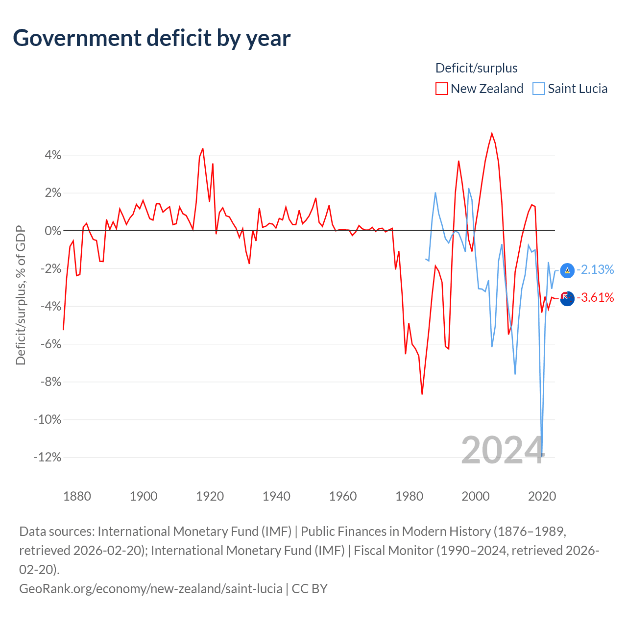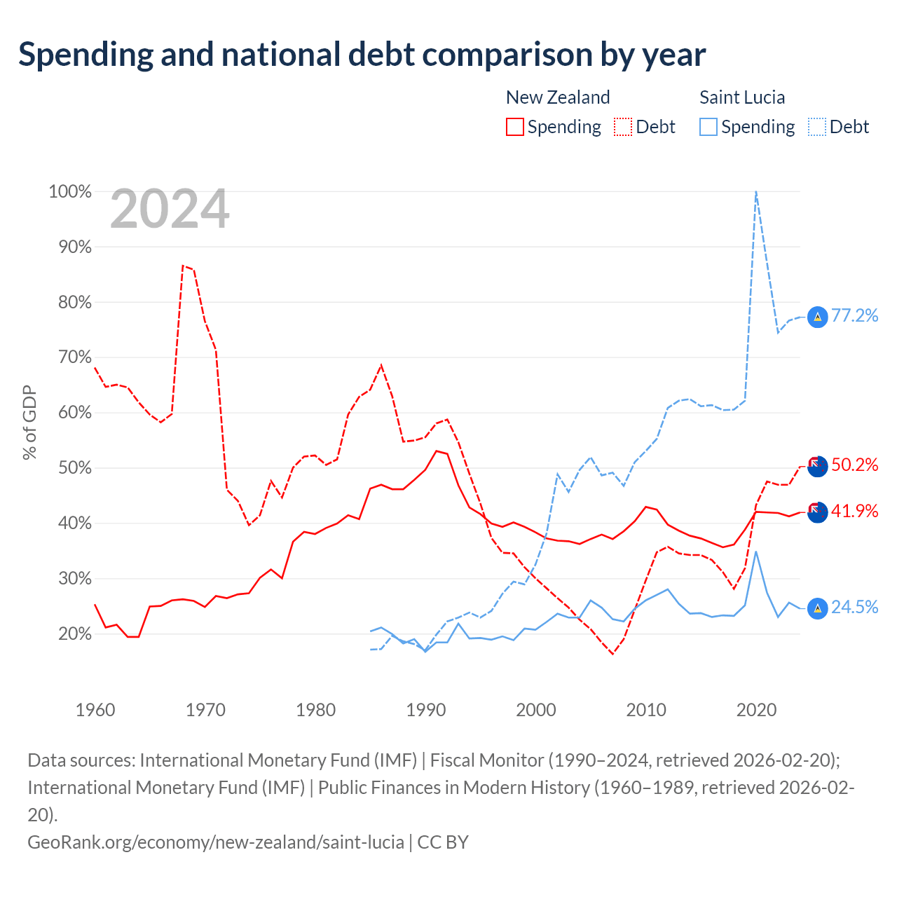 New Zealand has $131B in government debt (50.2% of GDP), compared to $1.97B (77.2% of GDP) in Saint Lucia.