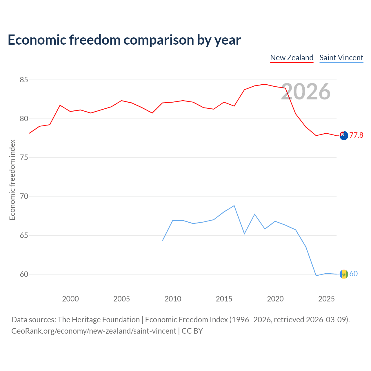 The Economic Freedom Index for New Zealand is 77.8, ranking 13/197, compared to 60 for Saint Vincent, ranking 98/197. The chart above displays a comparison of annual changes in economic freedom indexes.