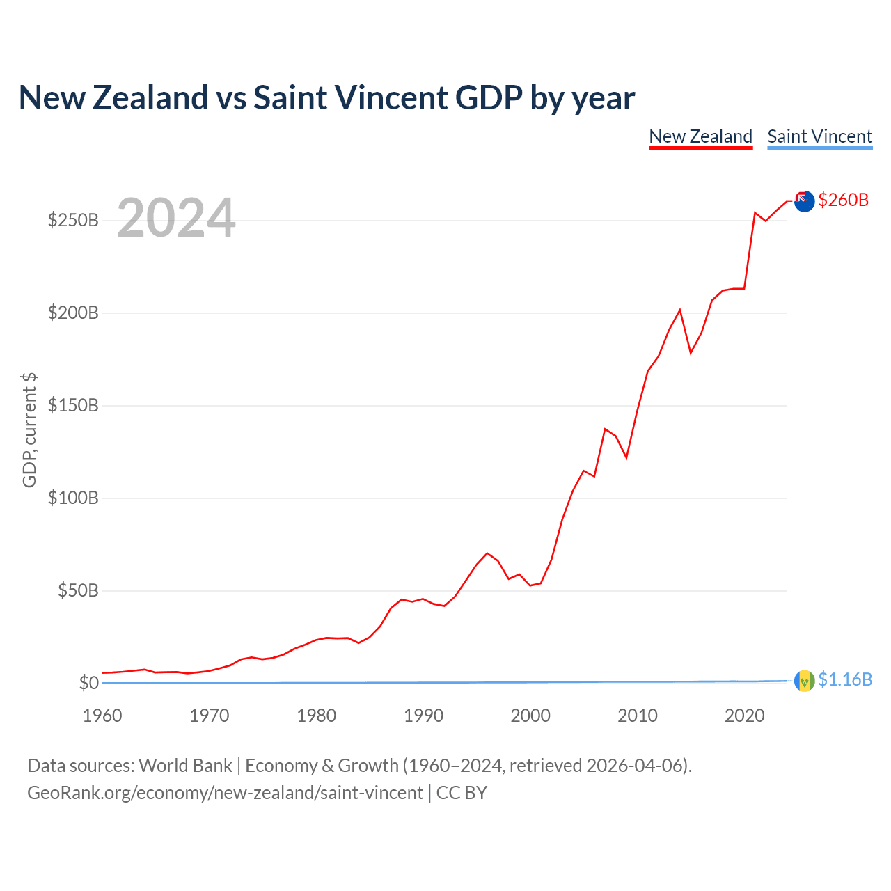 New Zealand has a GDP of $260B compared to $1.16B for Saint Vincent, ranking 52/197 and 186/197 by economy size, respectively.