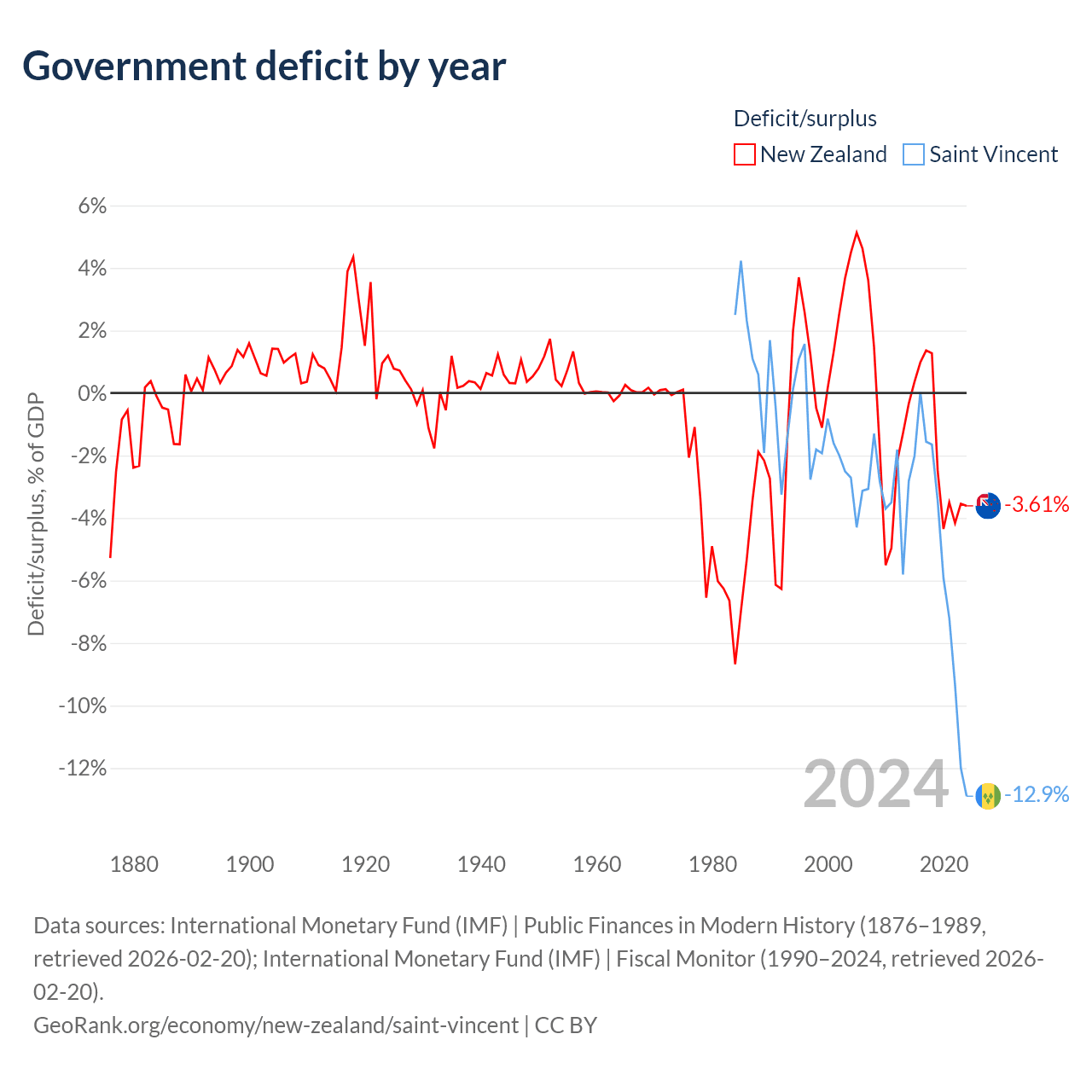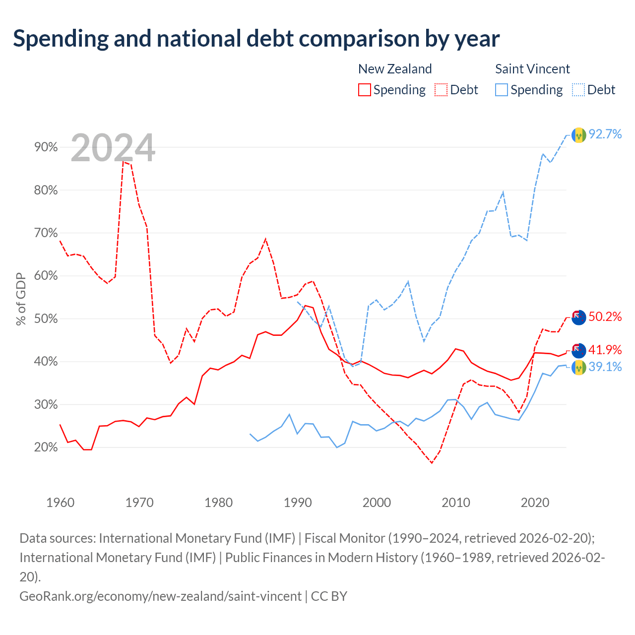 New Zealand has $131B in government debt (50.2% of GDP), compared to $1.07B (92.7% of GDP) in Saint Vincent.