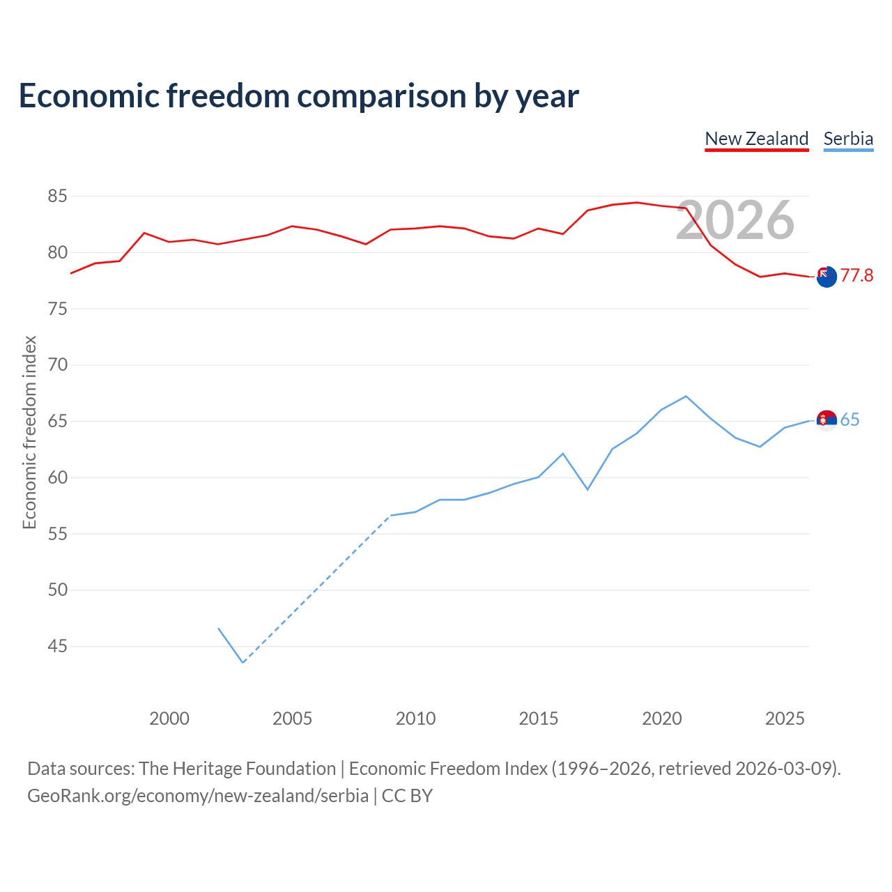 The Economic Freedom Index for New Zealand is 77.8, ranking 13/197, compared to 65 for Serbia, ranking 68/197. The chart above displays a comparison of annual changes in economic freedom indexes.