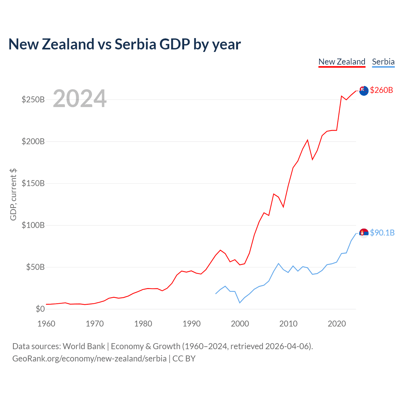 New Zealand vs Serbia GDP by year