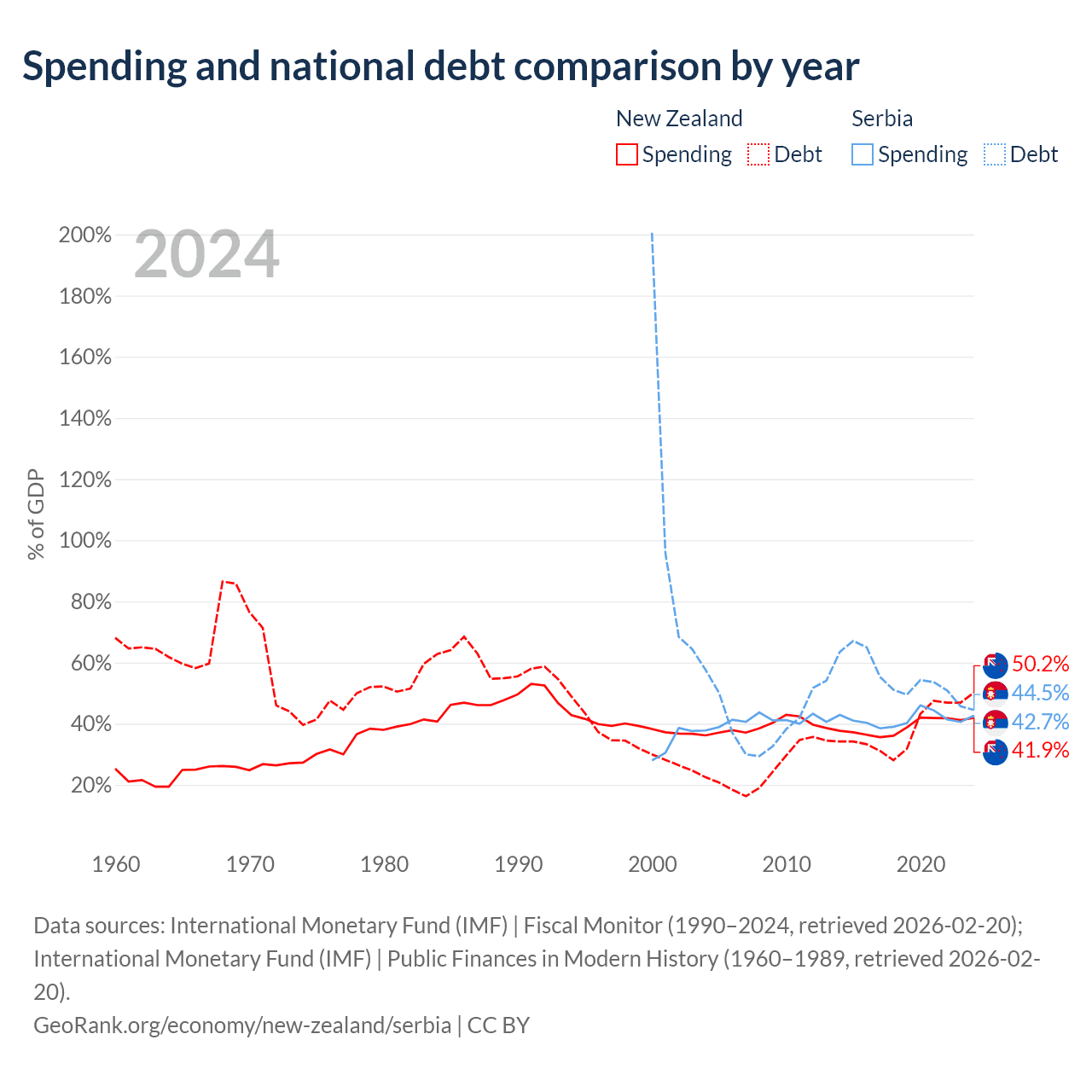 New Zealand has $131B in government debt (50.2% of GDP), compared to $40.1B (44.5% of GDP) in Serbia.
