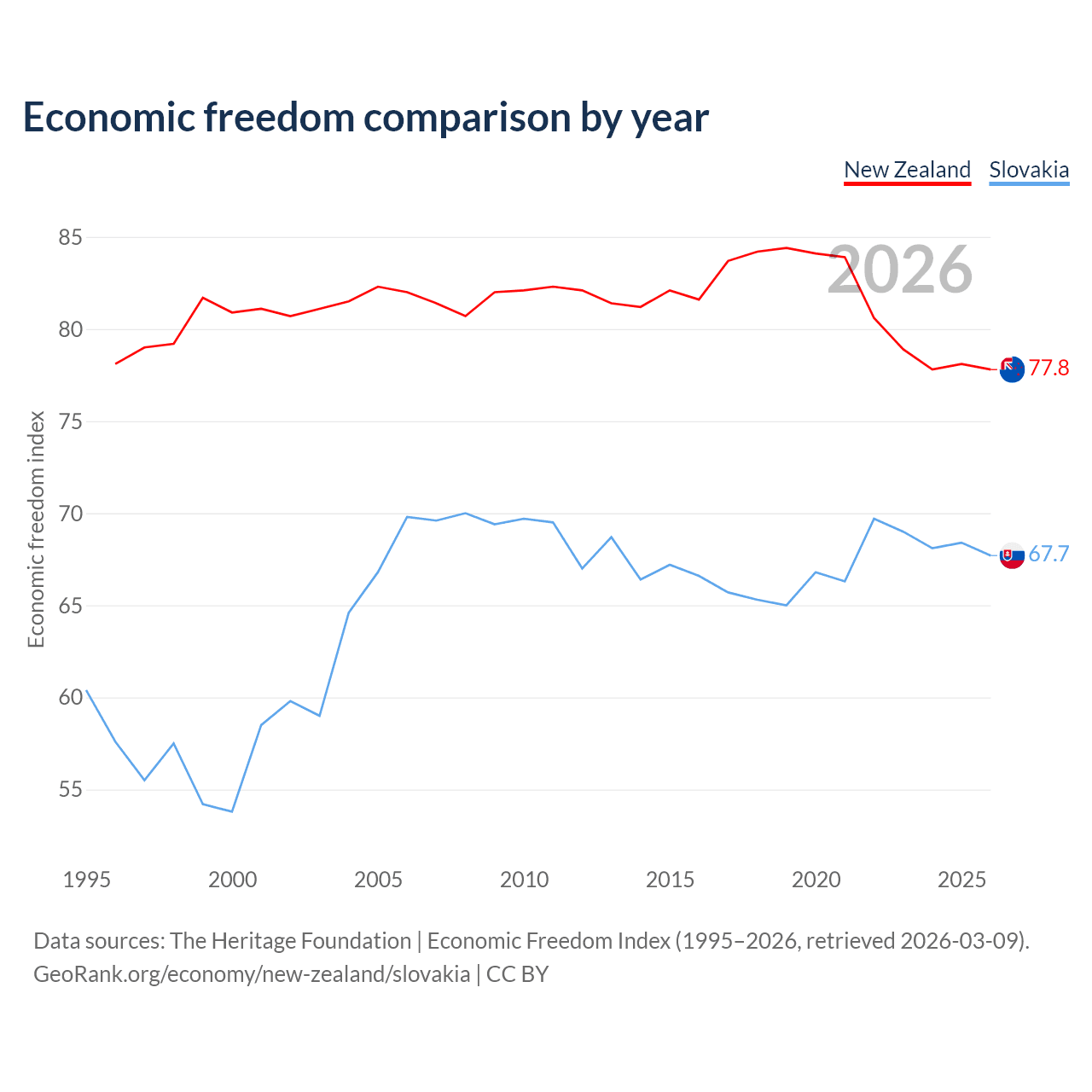 The Economic Freedom Index for New Zealand is 77.8, ranking 13/197, compared to 67.7 for Slovakia, ranking 54/197. The chart above displays a comparison of annual changes in economic freedom indexes.