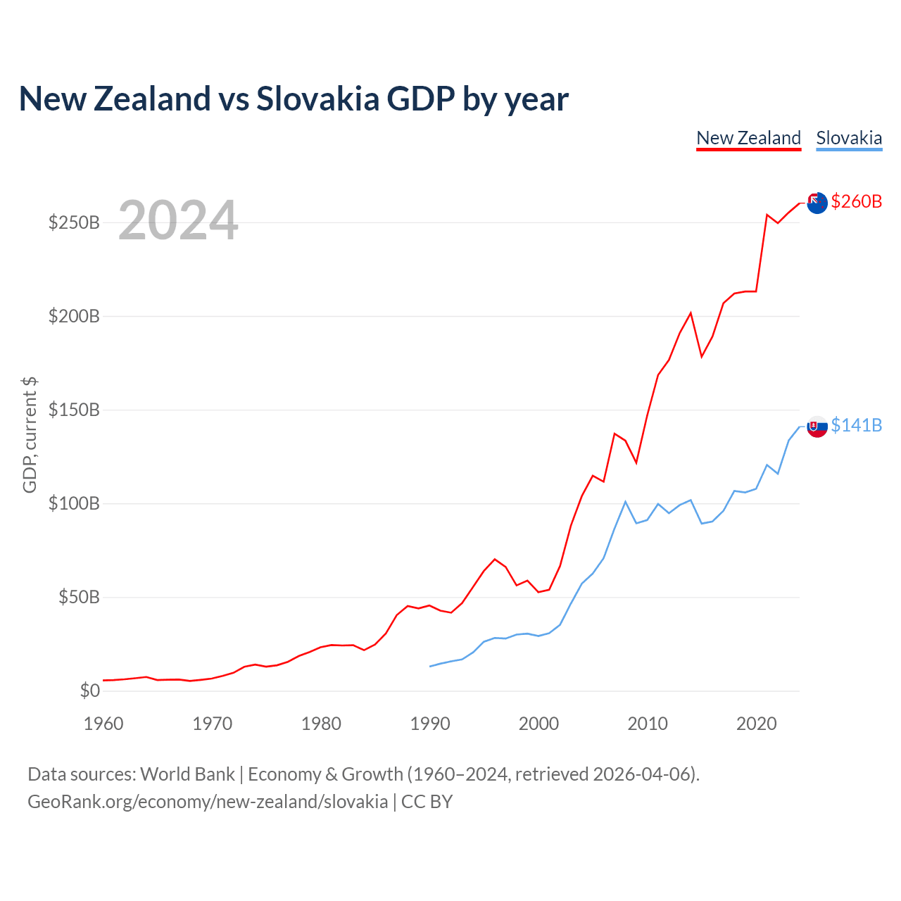 New Zealand has a GDP of $260B compared to $141B for Slovakia, ranking 52/197 and 61/197 by economy size, respectively.