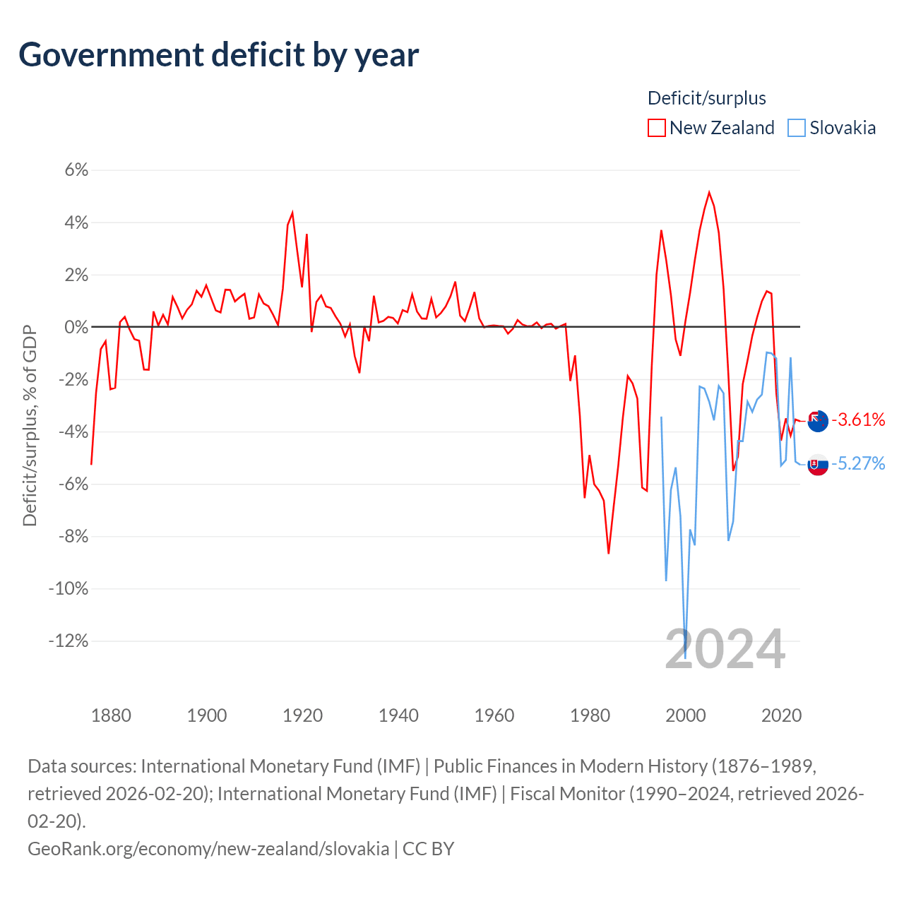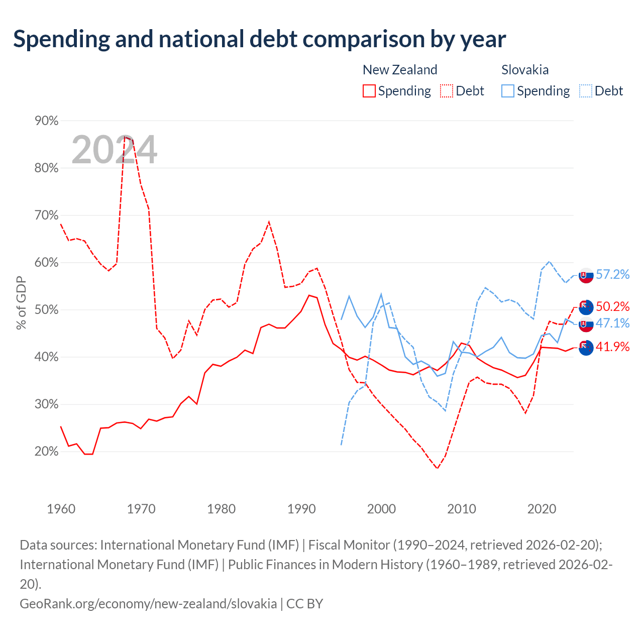 New Zealand has $131B in government debt (50.2% of GDP), compared to $80.7B (57.2% of GDP) in Slovakia.