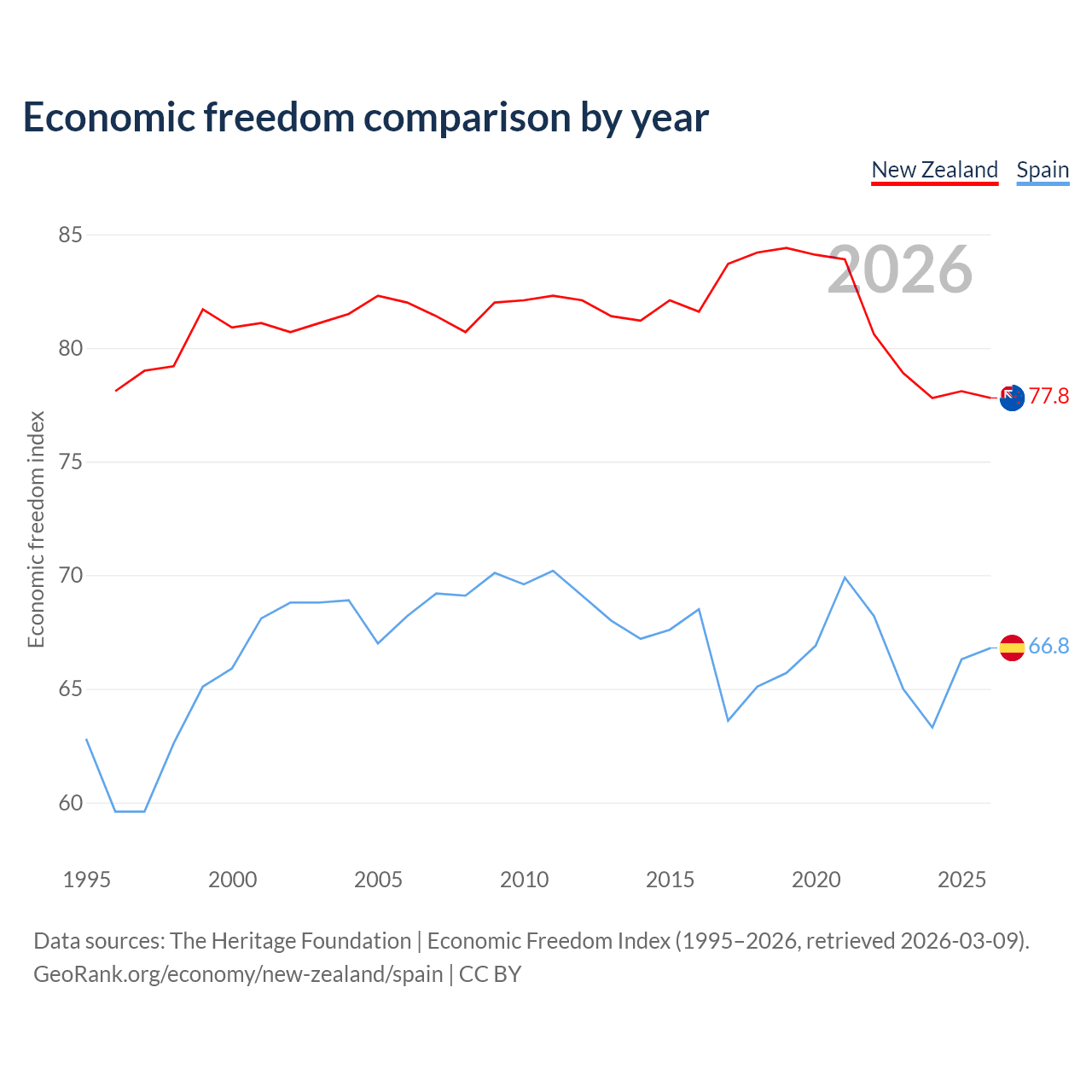 The Economic Freedom Index for New Zealand is 77.8, ranking 13/197, compared to 66.8 for Spain, ranking 59/197. The chart above displays a comparison of annual changes in economic freedom indexes.
