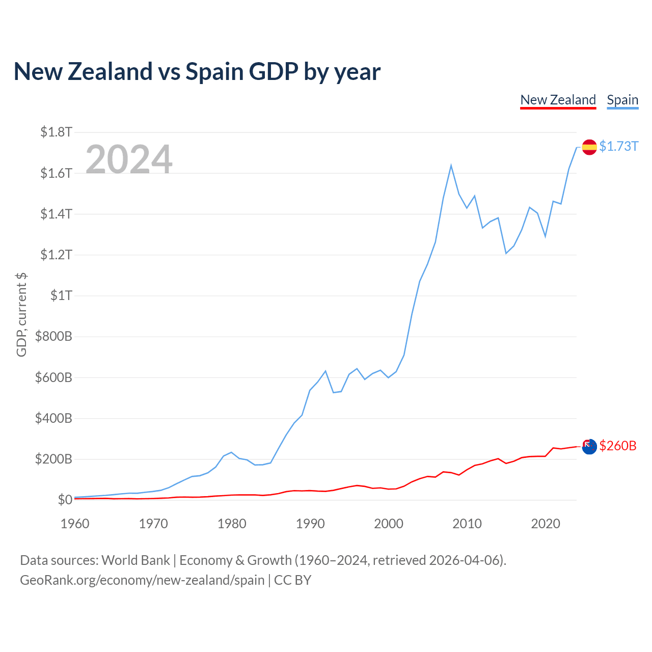 New Zealand has a GDP of $260B compared to $1.73T for Spain, ranking 52/197 and 15/197 by economy size, respectively.