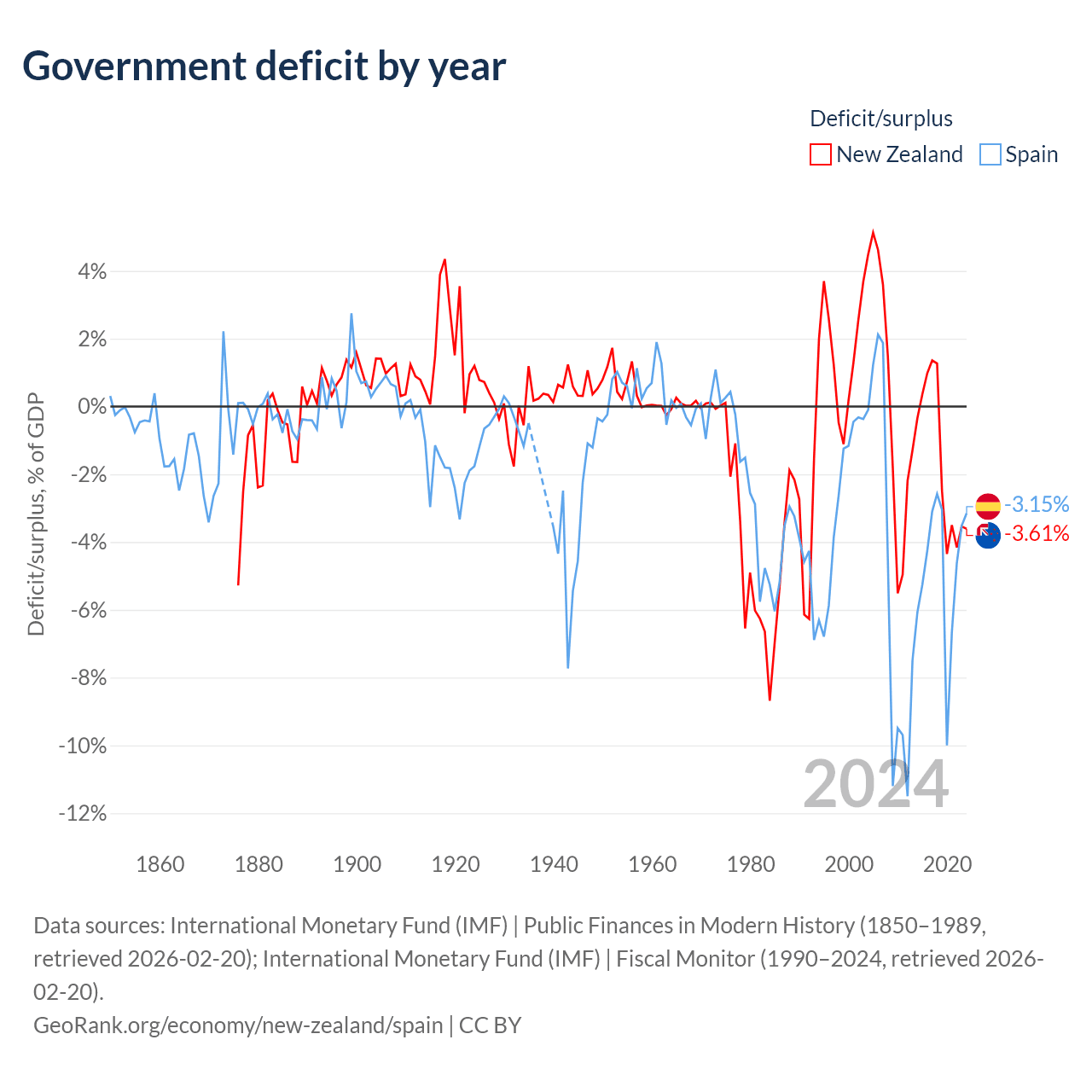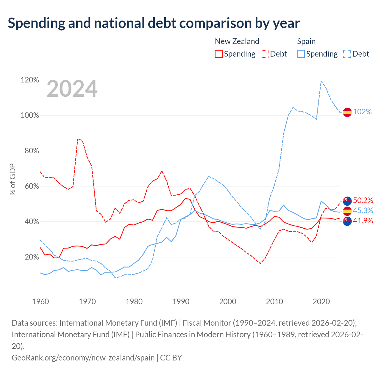 New Zealand has $131B in government debt (50.2% of GDP), compared to $1.75T (101.6% of GDP) in Spain.