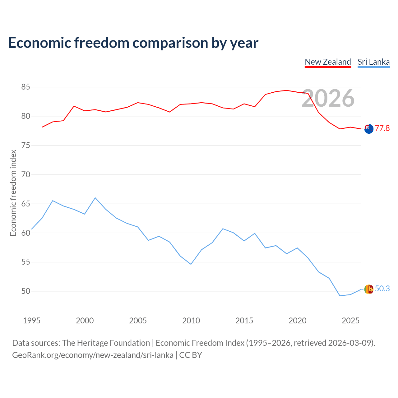 The Economic Freedom Index for New Zealand is 77.8, ranking 13/197, compared to 50.3 for Sri Lanka, ranking 162/197. The chart above displays a comparison of annual changes in economic freedom indexes.