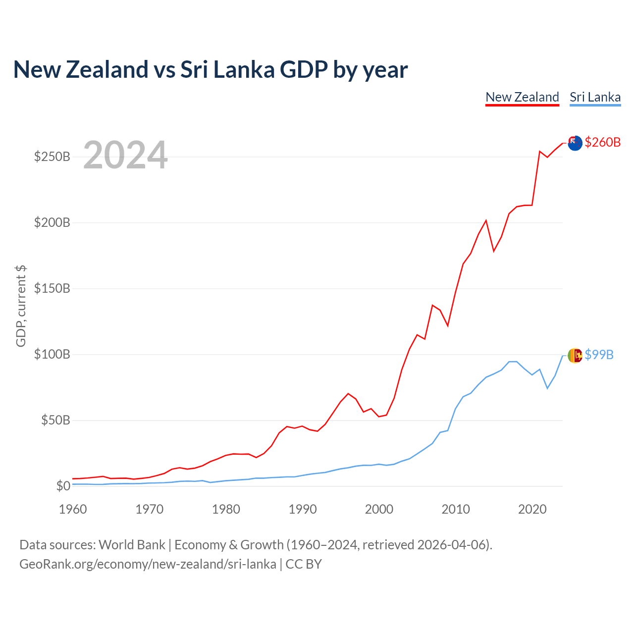 New Zealand vs Sri Lanka GDP by year