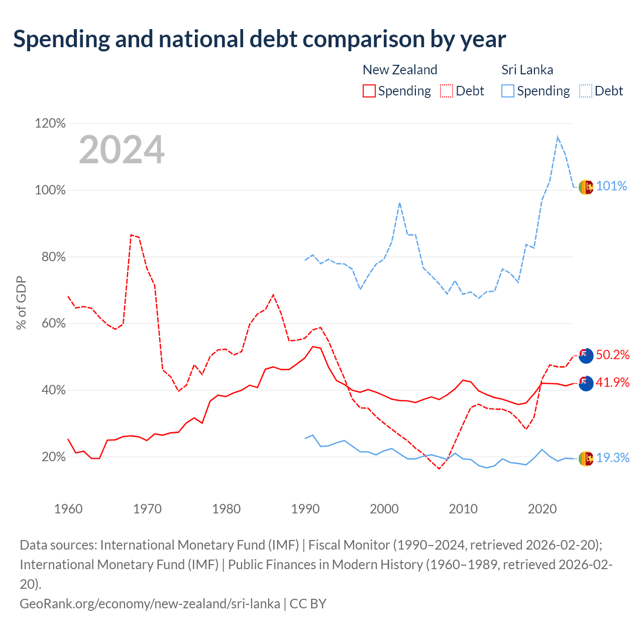 New Zealand has $131B in government debt (50.2% of GDP), compared to $99.8B (100.8% of GDP) in Sri Lanka.