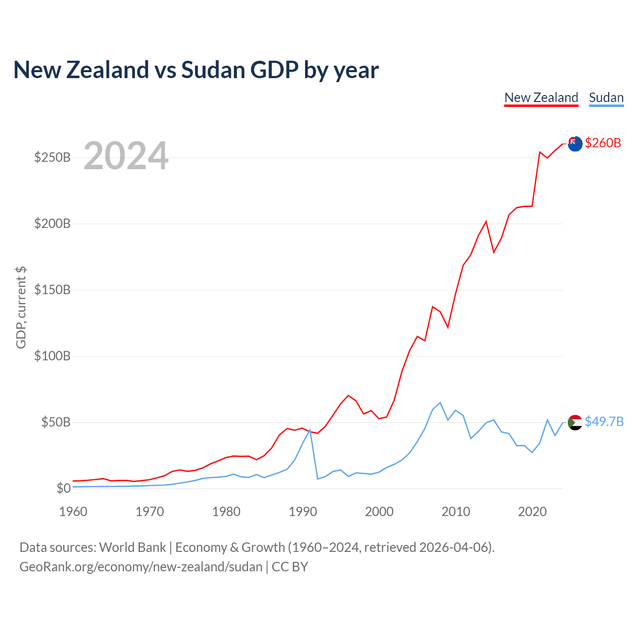 New Zealand vs Sudan GDP by year