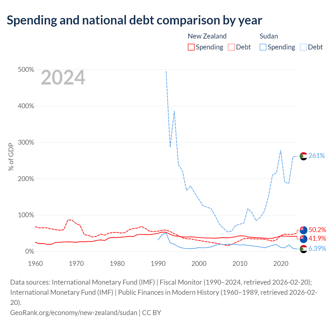New Zealand has $131B in government debt (50.2% of GDP), compared to $130B (261.4% of GDP) in Sudan.
