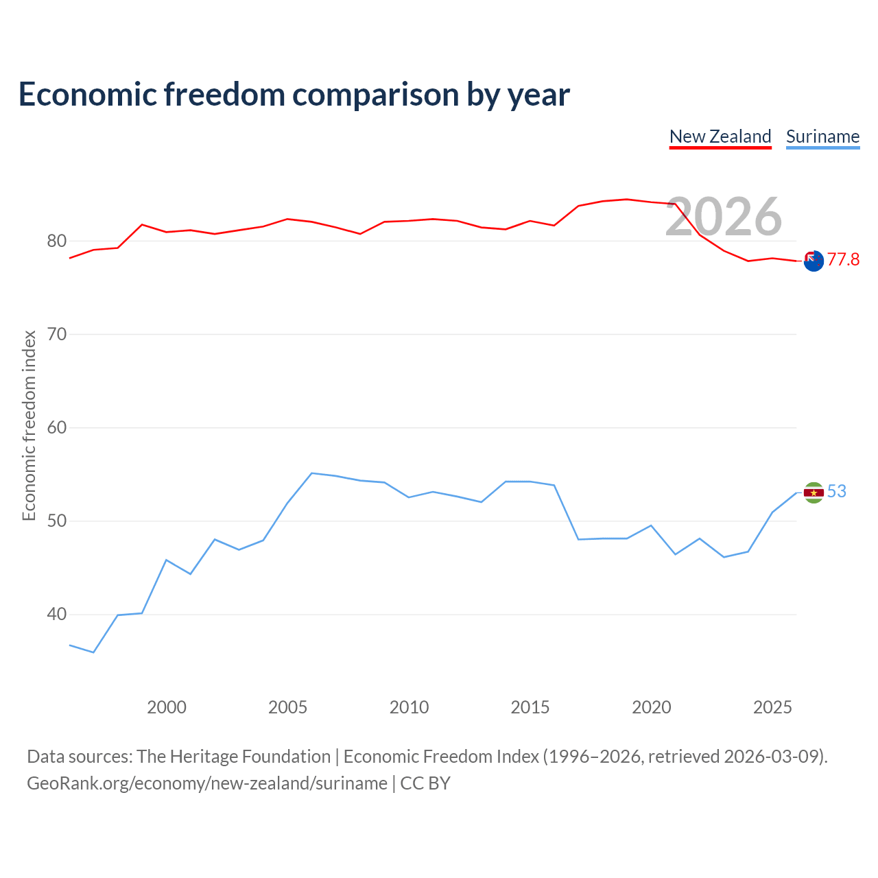 The Economic Freedom Index for New Zealand is 77.8, ranking 13/197, compared to 53 for Suriname, ranking 143/197. The chart above displays a comparison of annual changes in economic freedom indexes.