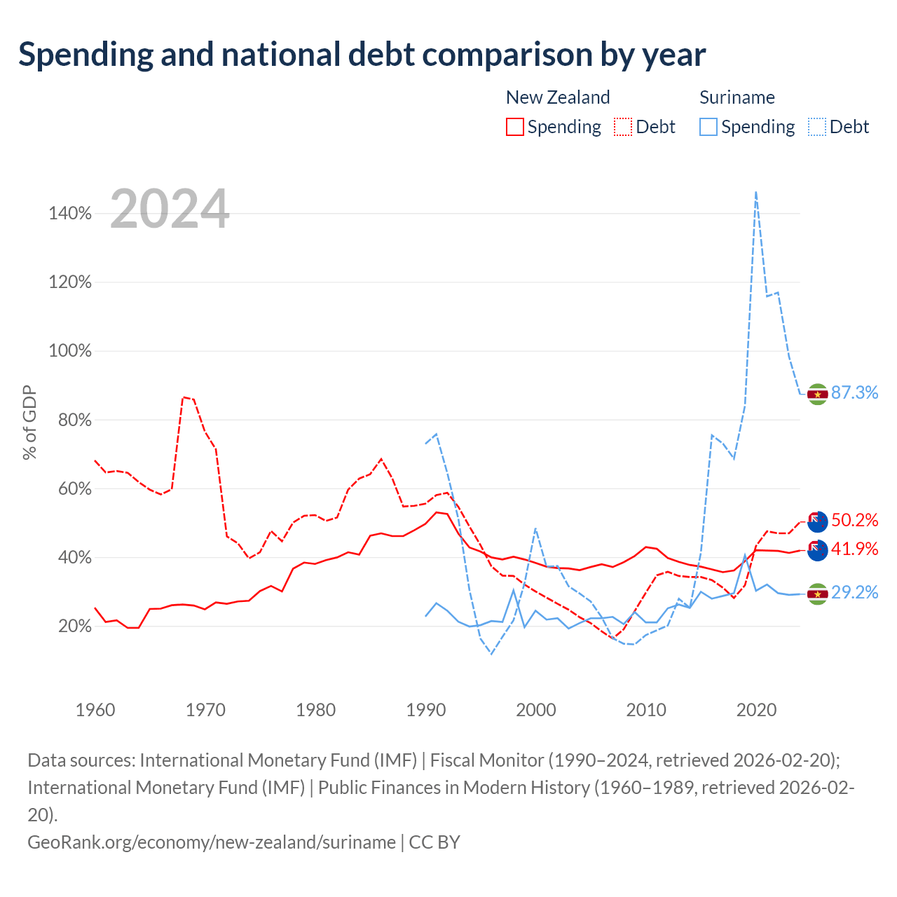 New Zealand has $131B in government debt (50.2% of GDP), compared to $3.86B (87.3% of GDP) in Suriname.