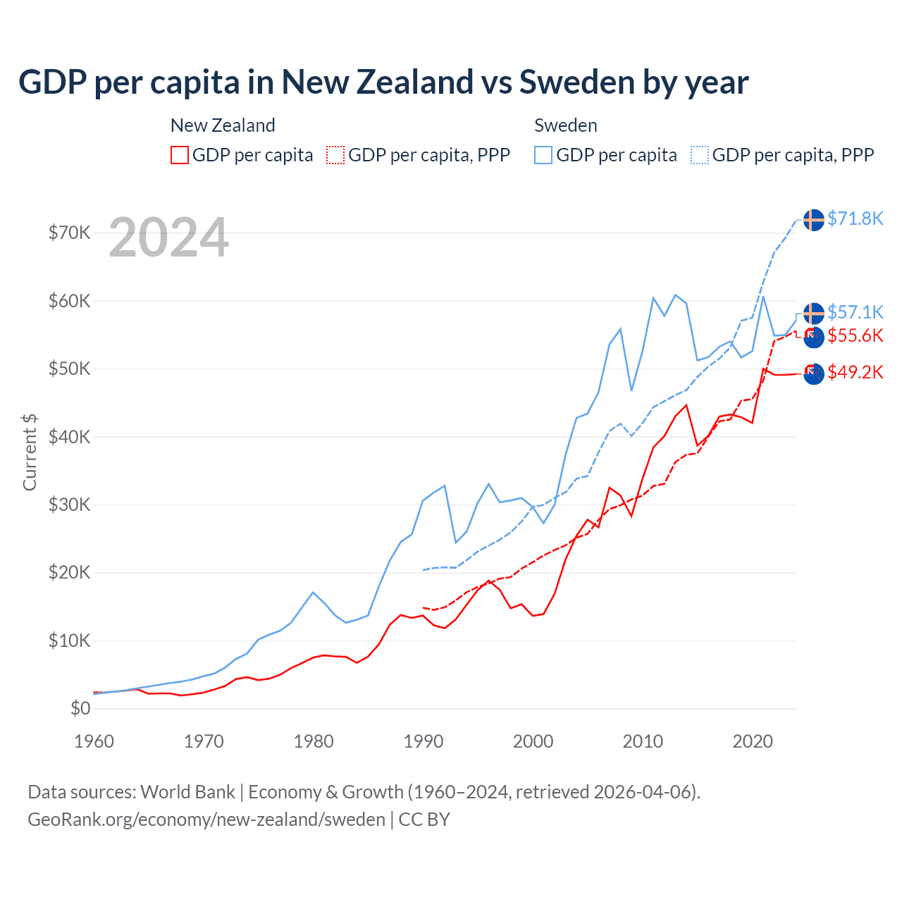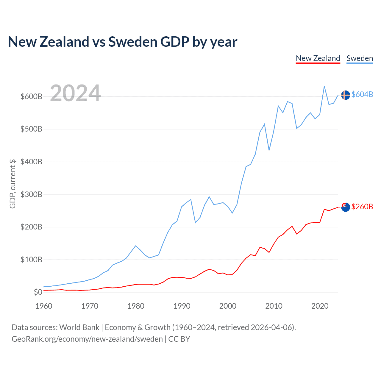 New Zealand vs Sweden GDP by year