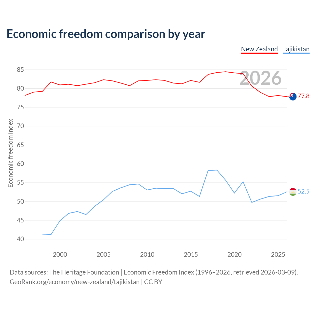 The Economic Freedom Index for New Zealand is 77.8, ranking 13/197, compared to 52.5 for Tajikistan, ranking 147/197. The chart above displays a comparison of annual changes in economic freedom indexes.