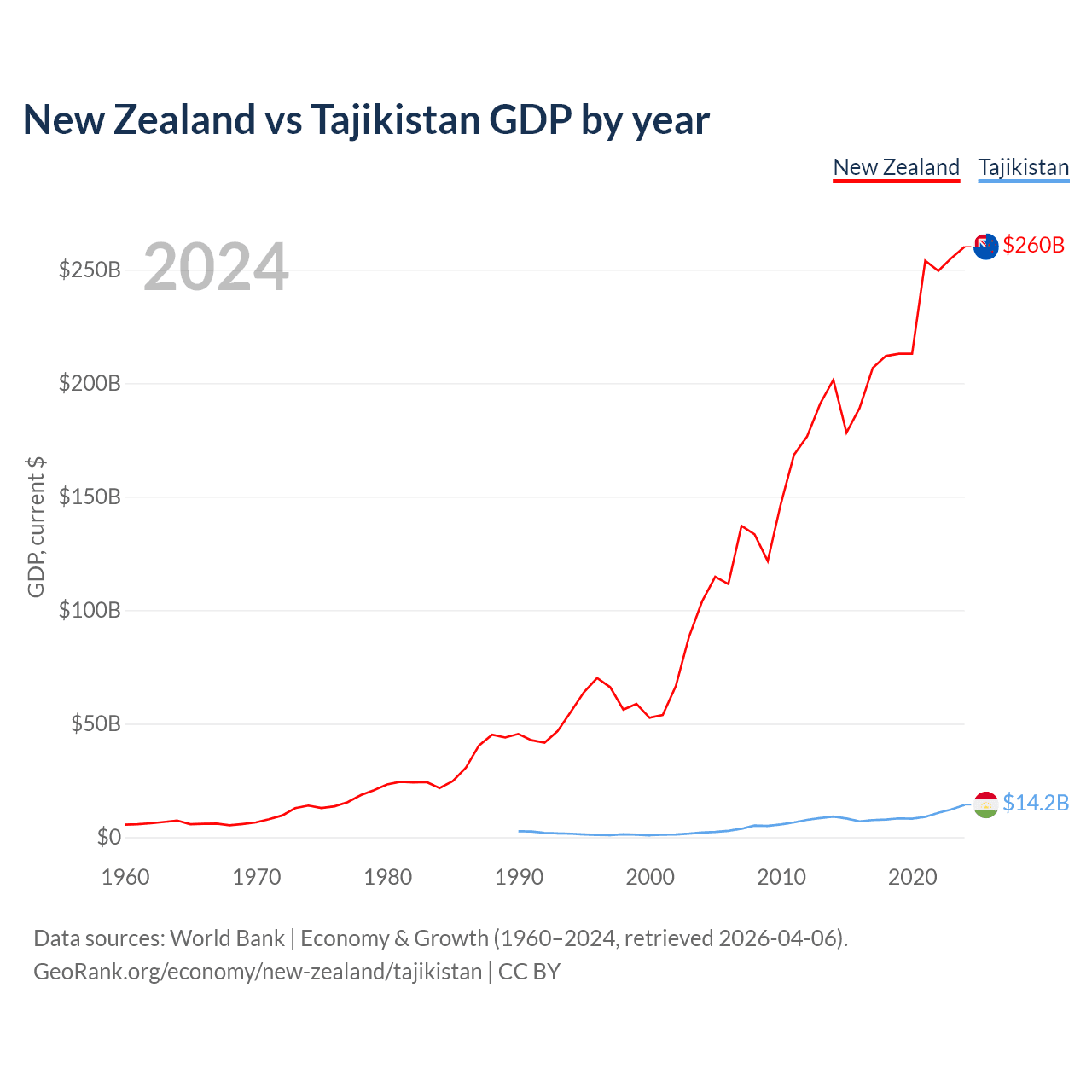 New Zealand has a GDP of $260B compared to $14.2B for Tajikistan, ranking 52/197 and 145/197 by economy size, respectively.