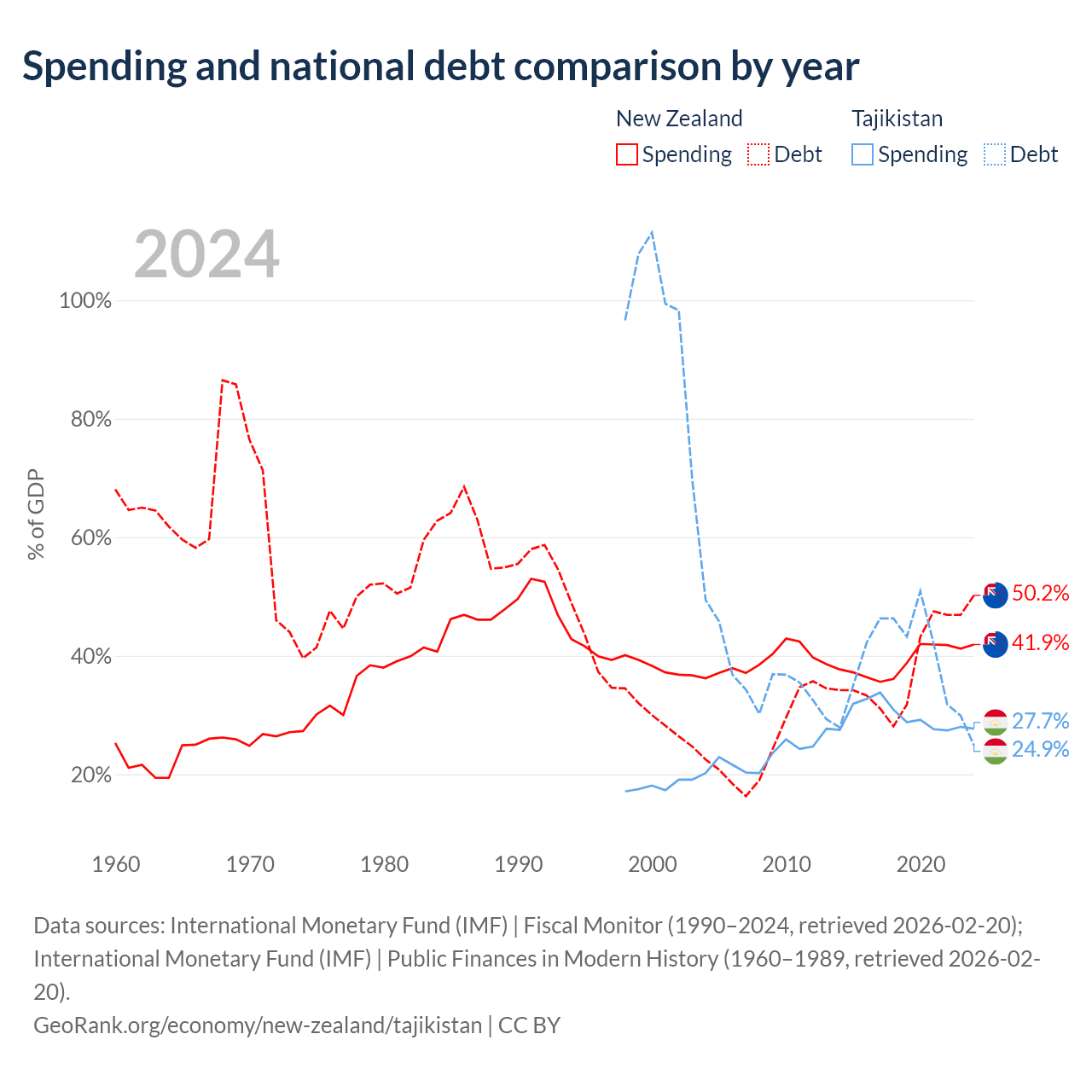 New Zealand has $131B in government debt (50.2% of GDP), compared to $3.54B (24.9% of GDP) in Tajikistan.