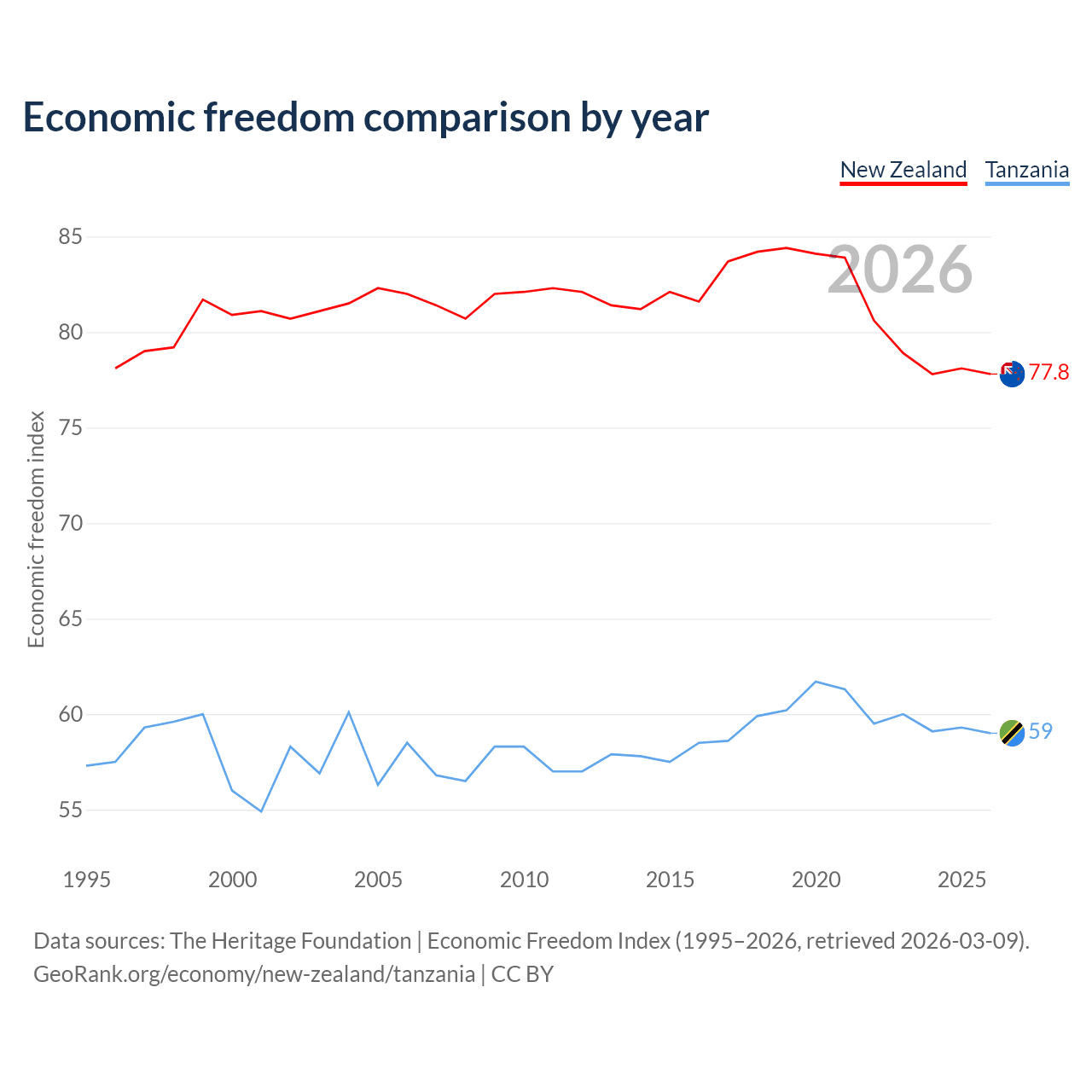 The Economic Freedom Index for New Zealand is 77.8, ranking 13/197, compared to 59 for Tanzania, ranking 106/197. The chart above displays a comparison of annual changes in economic freedom indexes.