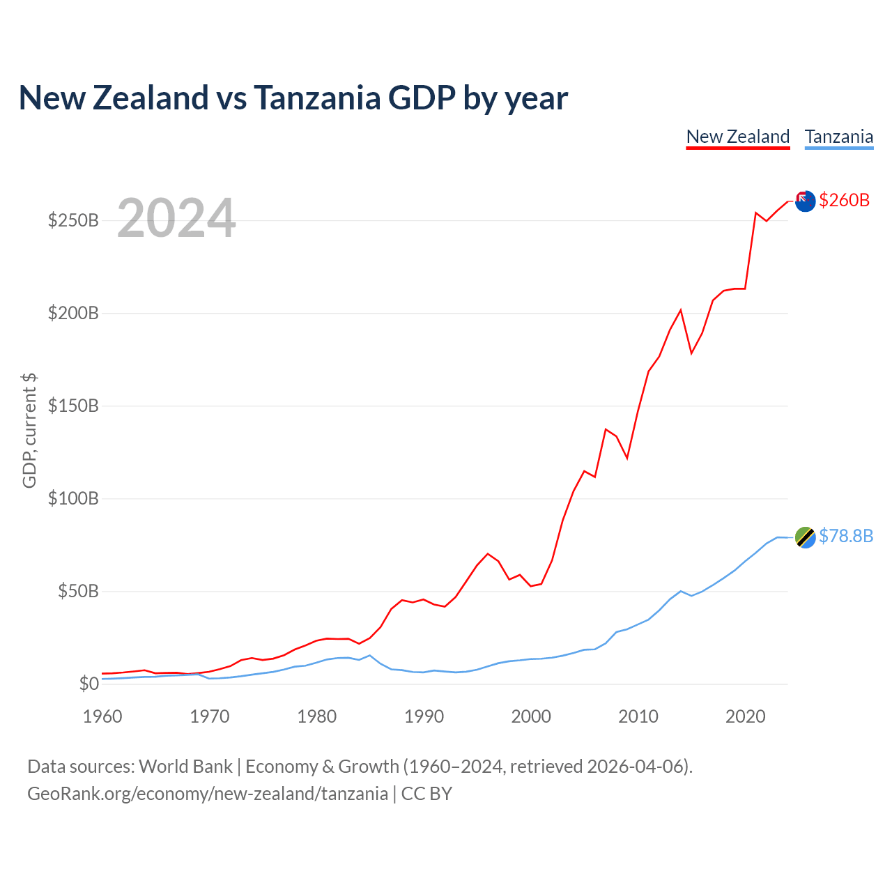 New Zealand vs Tanzania GDP by year