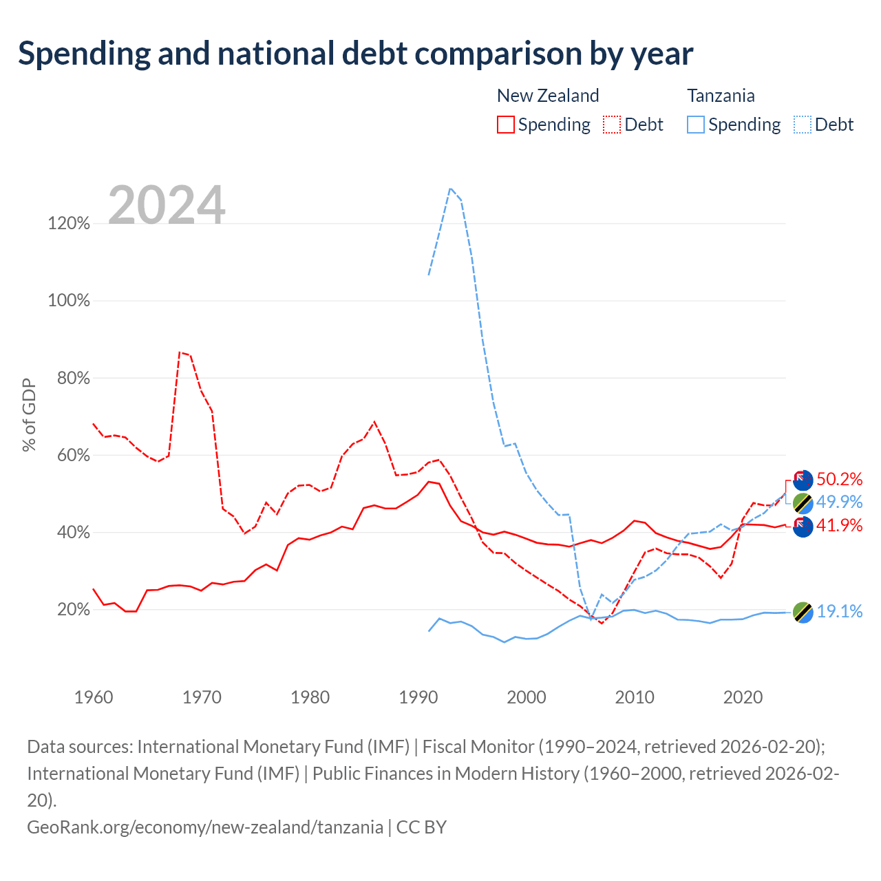New Zealand has $131B in government debt (50.2% of GDP), compared to $39.3B (49.9% of GDP) in Tanzania.