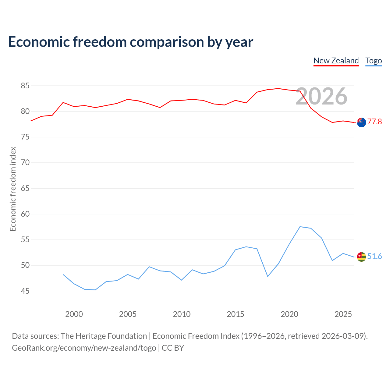 The Economic Freedom Index for New Zealand is 77.8, ranking 13/197, compared to 51.6 for Togo, ranking 153/197. The chart above displays a comparison of annual changes in economic freedom indexes.
