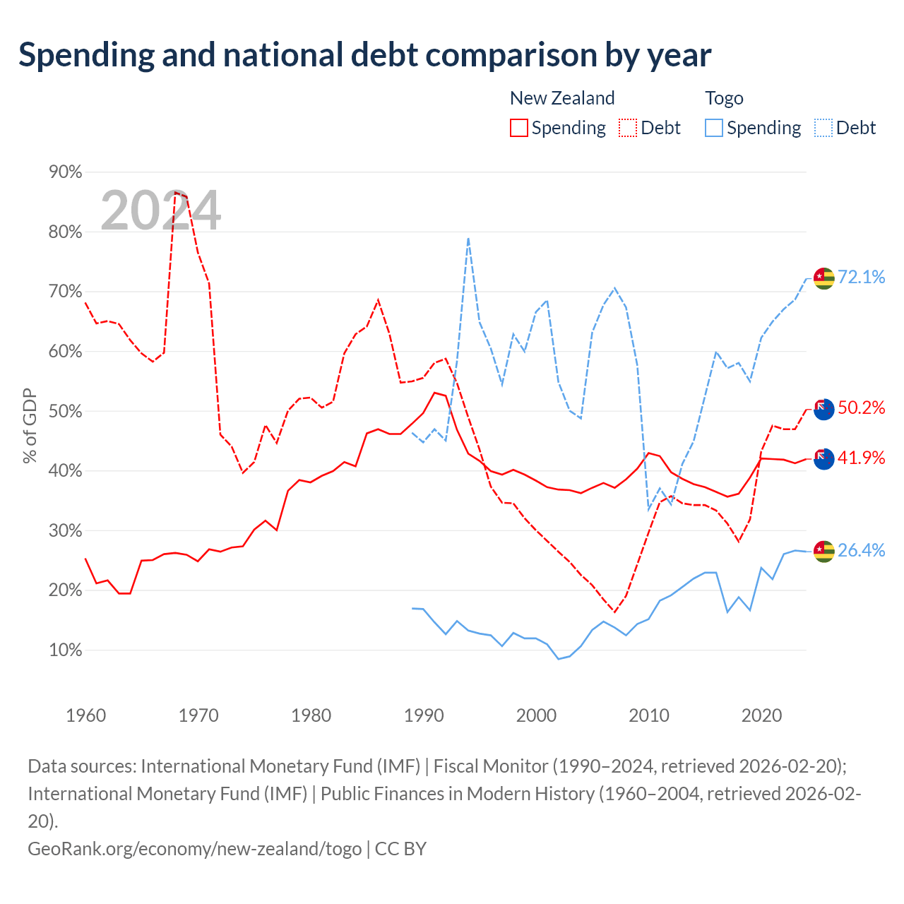 New Zealand has $131B in government debt (50.2% of GDP), compared to $7.68B (72.1% of GDP) in Togo.