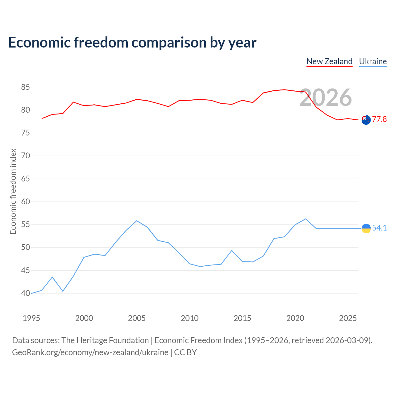 The Economic Freedom Index for New Zealand is 77.8, ranking 13/197, compared to 54.1 for Ukraine, ranking 135/197. The chart above displays a comparison of annual changes in economic freedom indexes.