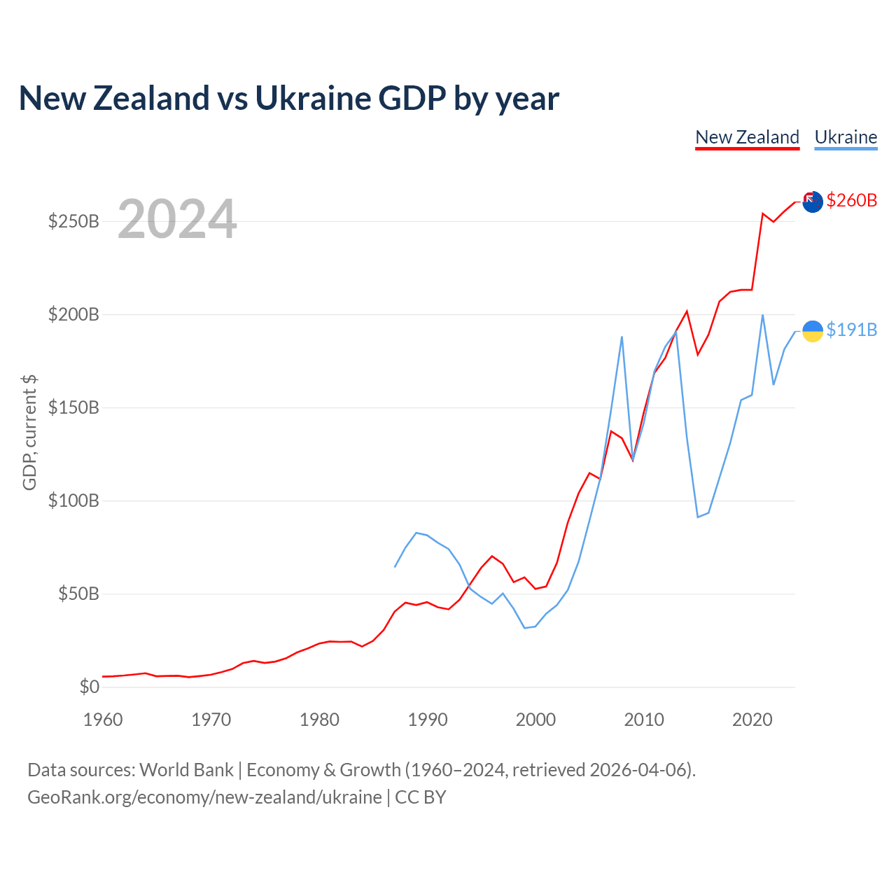 New Zealand has a GDP of $260B compared to $191B for Ukraine, ranking 52/197 and 57/197 by economy size, respectively.