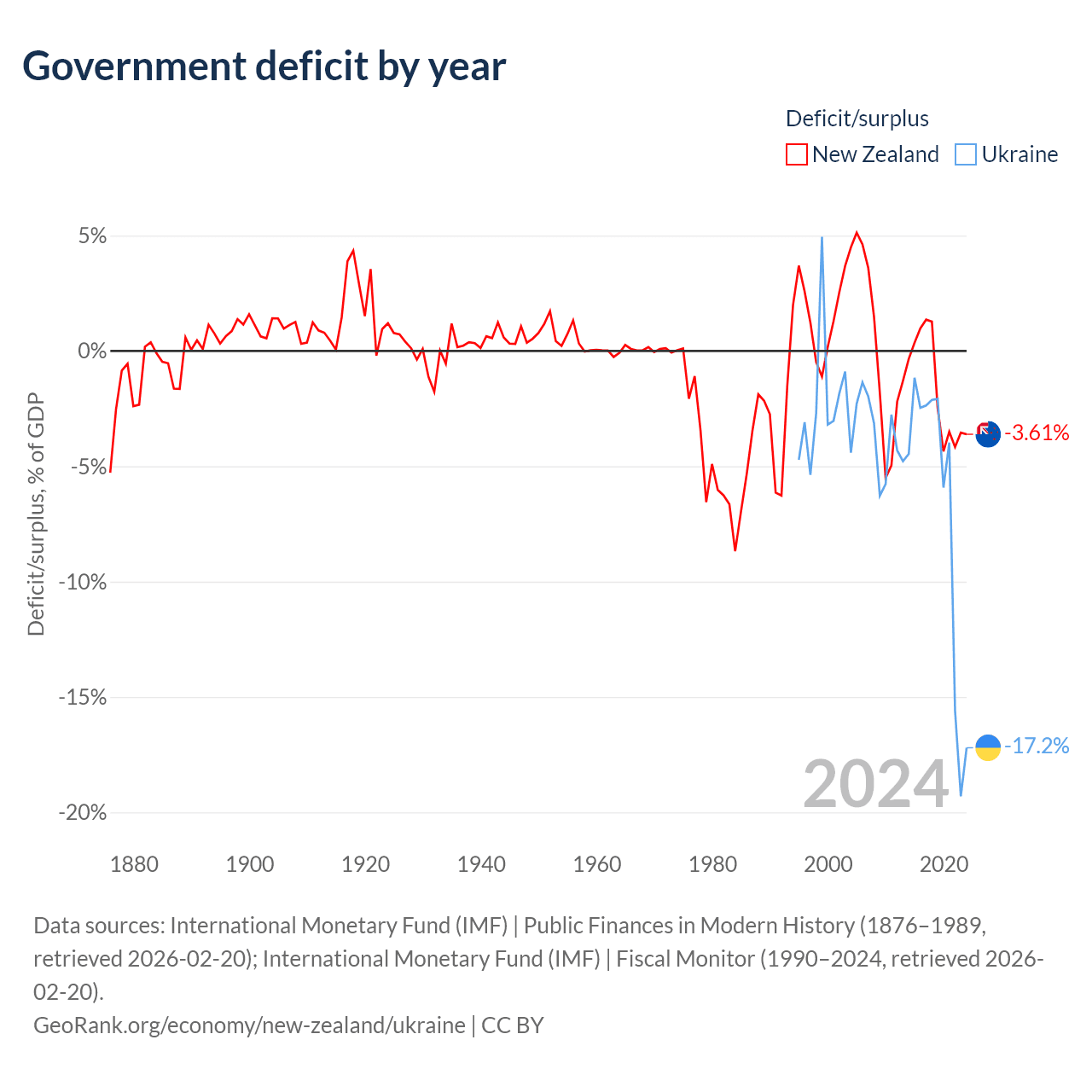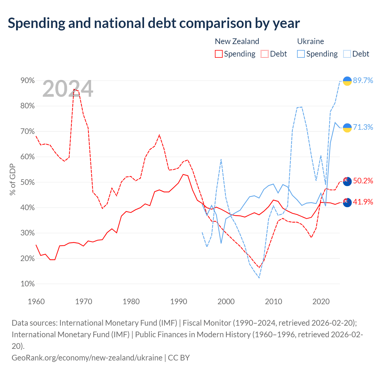 New Zealand has $131B in government debt (50.2% of GDP), compared to $171B (89.7% of GDP) in Ukraine.