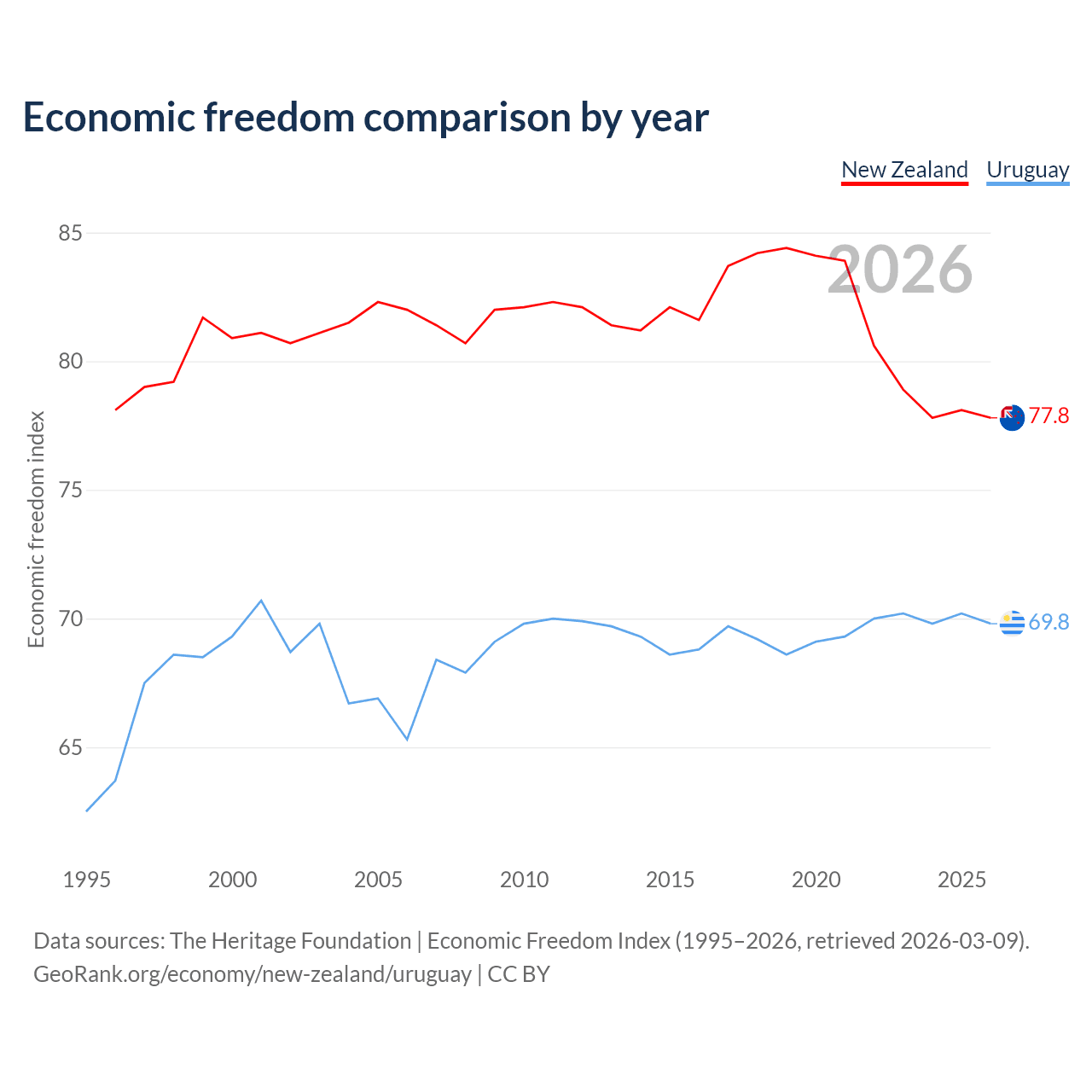 The Economic Freedom Index for New Zealand is 77.8, ranking 13/197, compared to 69.8 for Uruguay, ranking 39/197. The chart above displays a comparison of annual changes in economic freedom indexes.