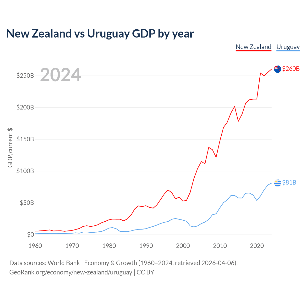 New Zealand has a GDP of $260B compared to $81B for Uruguay, ranking 52/197 and 81/197 by economy size, respectively.
