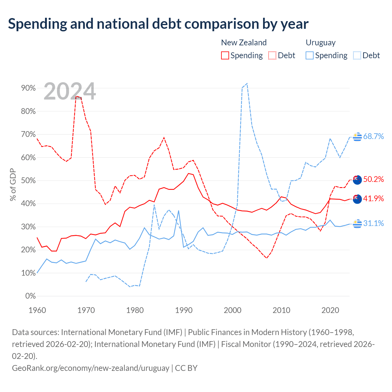 New Zealand has $131B in government debt (50.2% of GDP), compared to $55.6B (68.7% of GDP) in Uruguay.