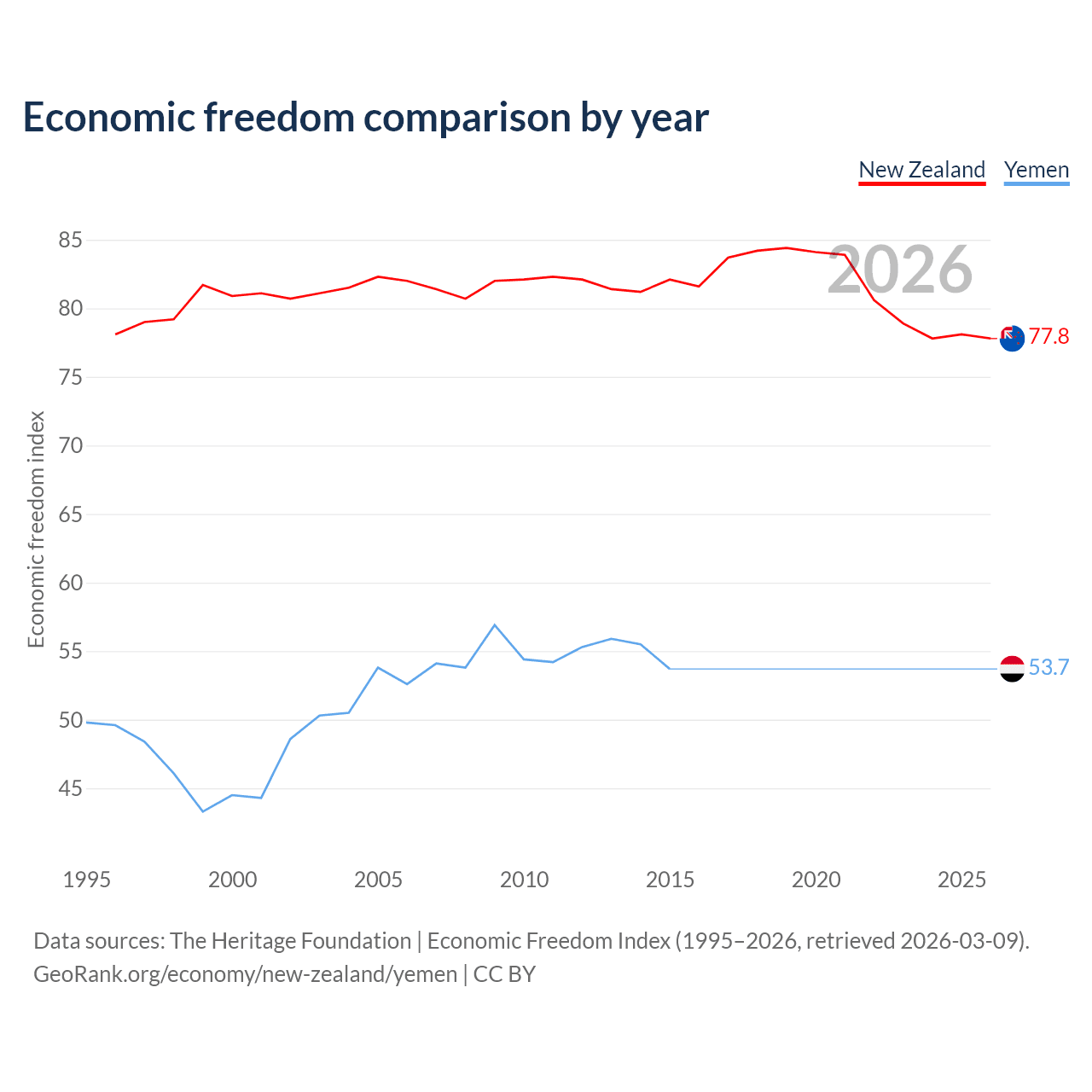 The Economic Freedom Index for New Zealand is 77.8, ranking 13/197, compared to 53.7 for Yemen, ranking 138/197. The chart above displays a comparison of annual changes in economic freedom indexes.