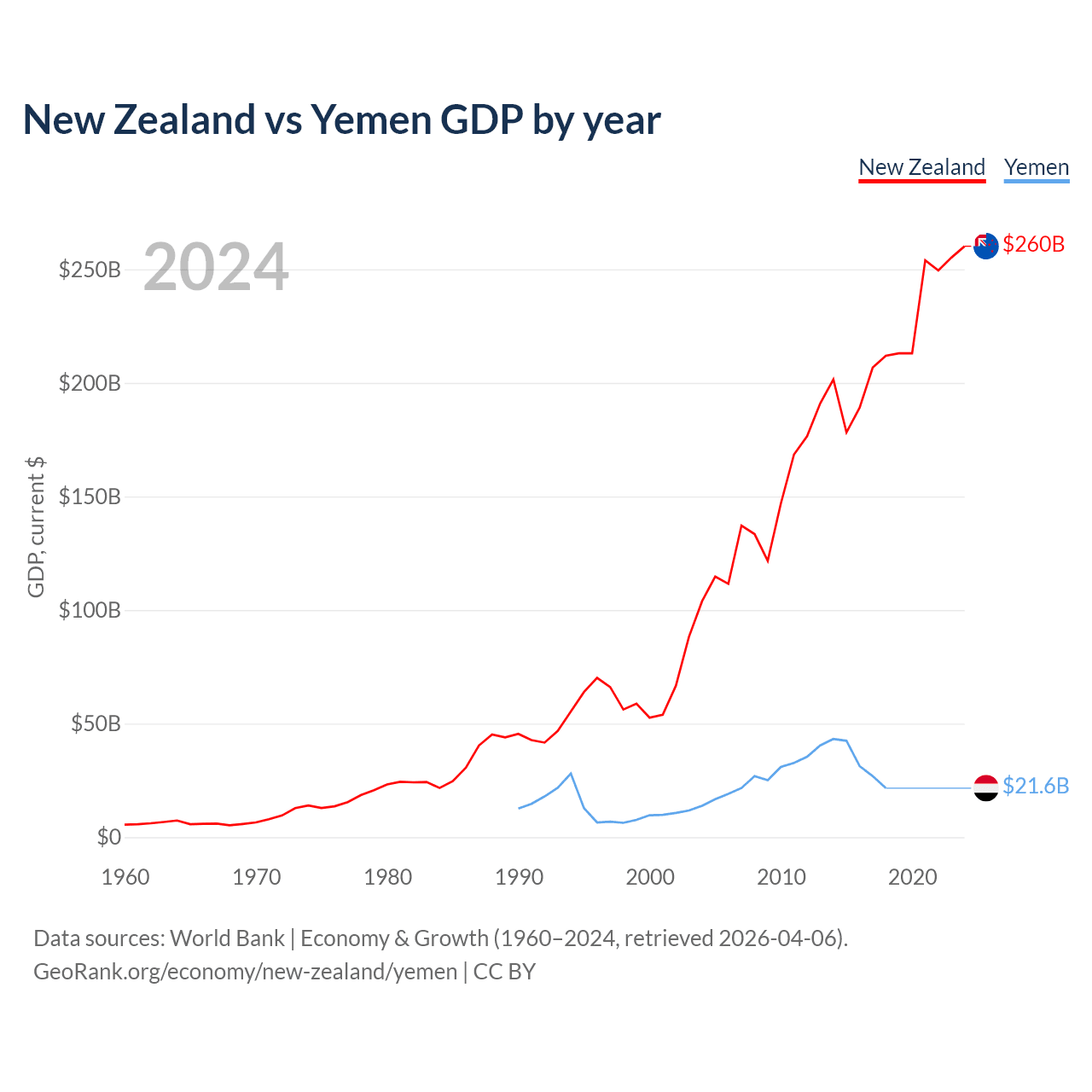 New Zealand has a GDP of $260B compared to $21.6B for Yemen, ranking 52/197 and 125/197 by economy size, respectively.