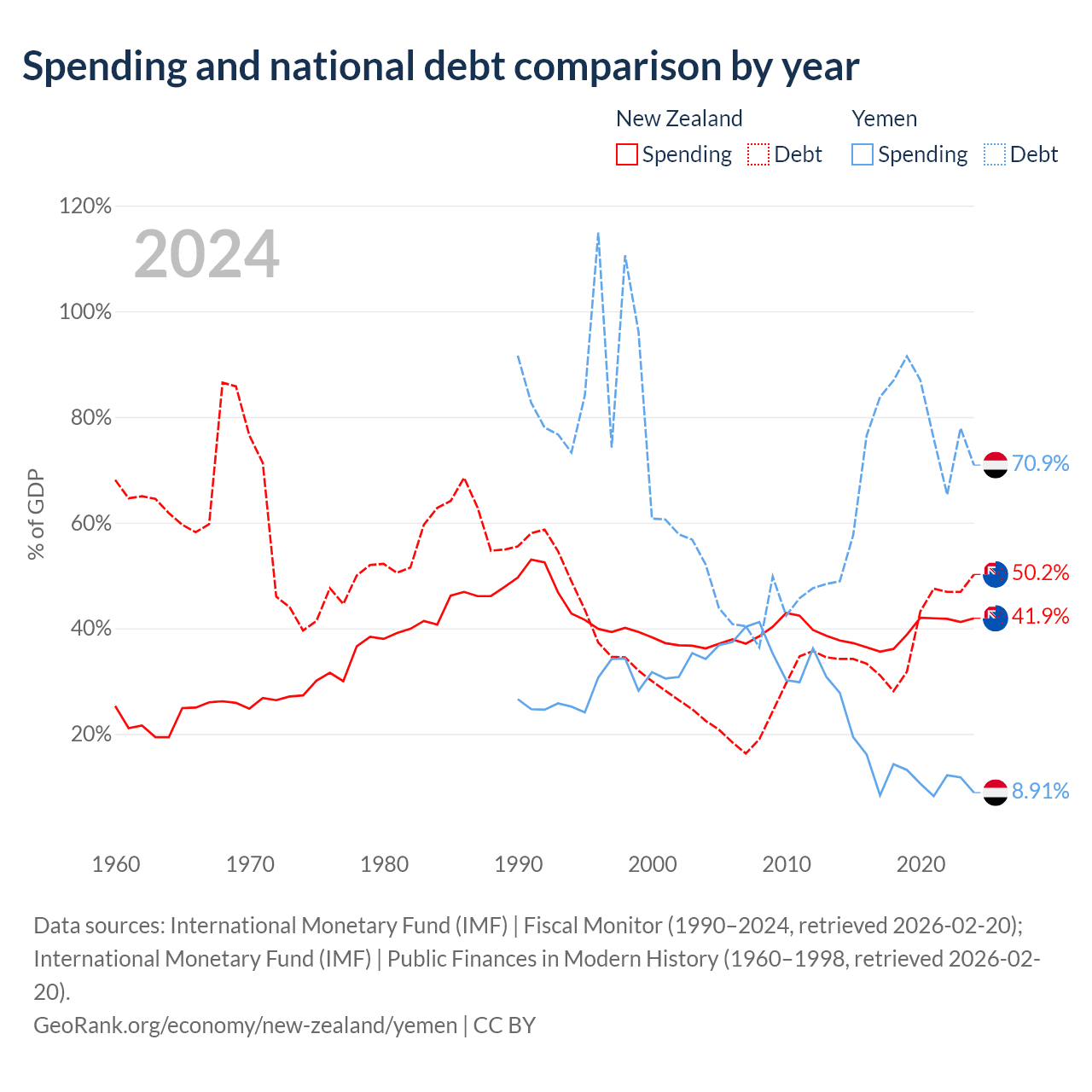 New Zealand has $131B in government debt (50.2% of GDP), compared to $18.8B (70.9% of GDP) in Yemen.