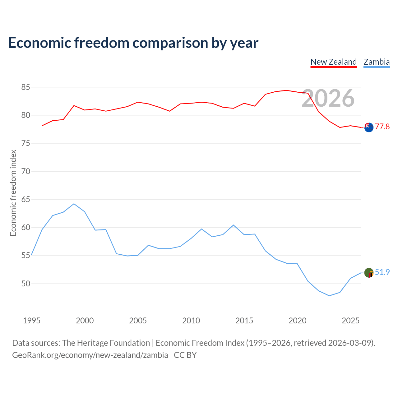 The Economic Freedom Index for New Zealand is 77.8, ranking 13/197, compared to 51.9 for Zambia, ranking 152/197. The chart above displays a comparison of annual changes in economic freedom indexes.