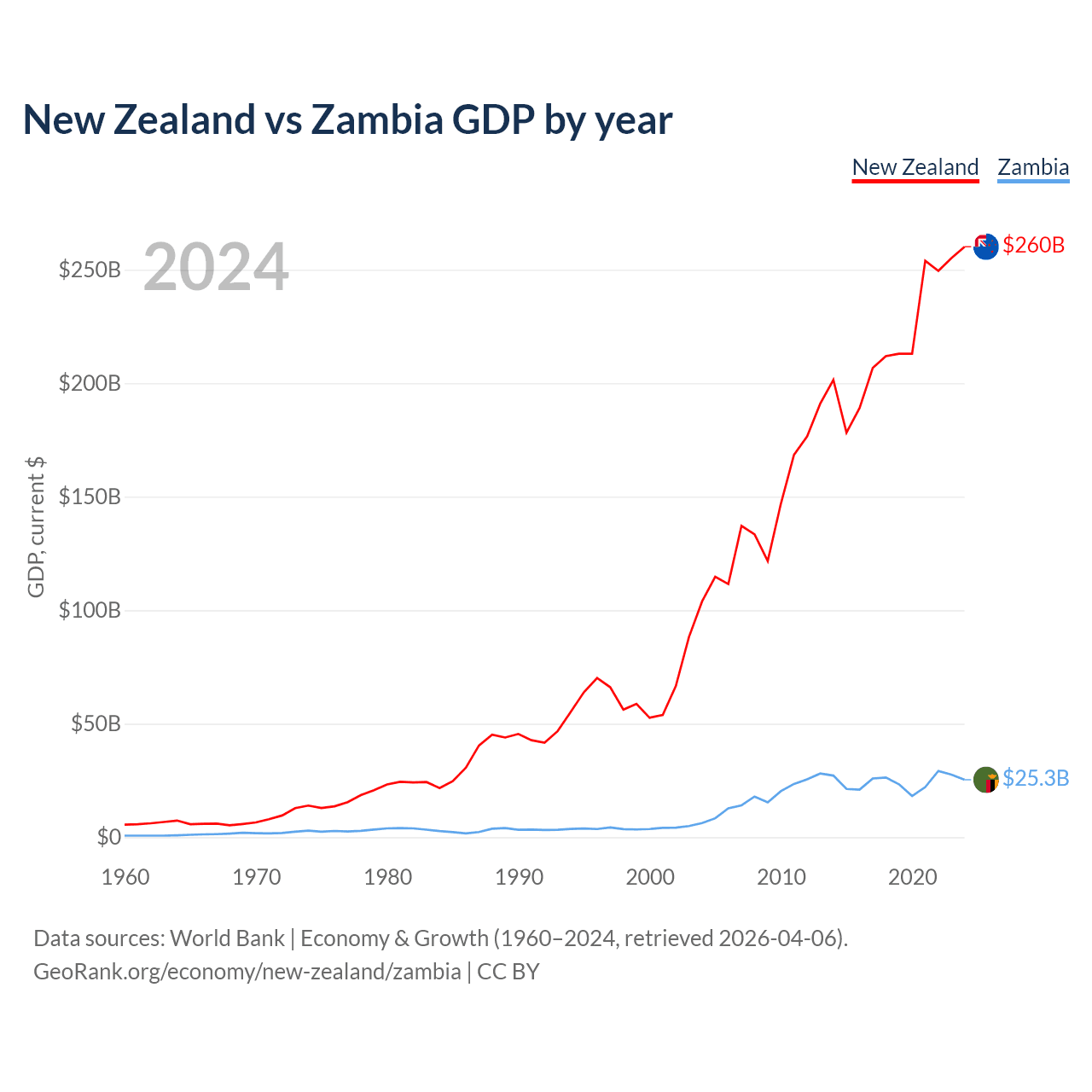 New Zealand has a GDP of $260B compared to $25.3B for Zambia, ranking 52/197 and 116/197 by economy size, respectively.